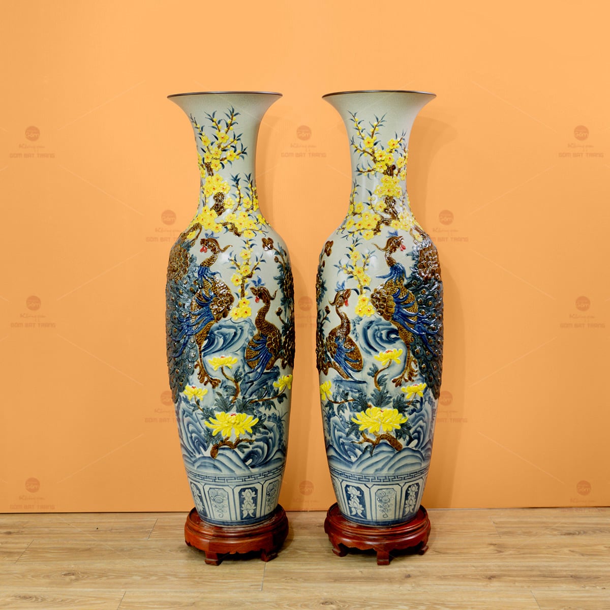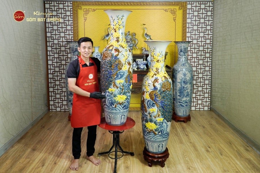 Trên nền men ấy, hình ảnh chim công và hoa đào được nghệ nhân đắp nổi thủ công tỉ mỉ, từng chi tiết lông công, cánh hoa đều hiện lên sống động, có chiều sâu, tạo hiệu ứng 3D mạnh mẽ. Kỹ thuật này đòi hỏi tay nghề cao, sự khéo léo và tính kiên nhẫn, bởi mỗi chi tiết đều được gọt, nặn, chạm, phủ men và nung nhiều lần để đạt độ hoàn hảo.