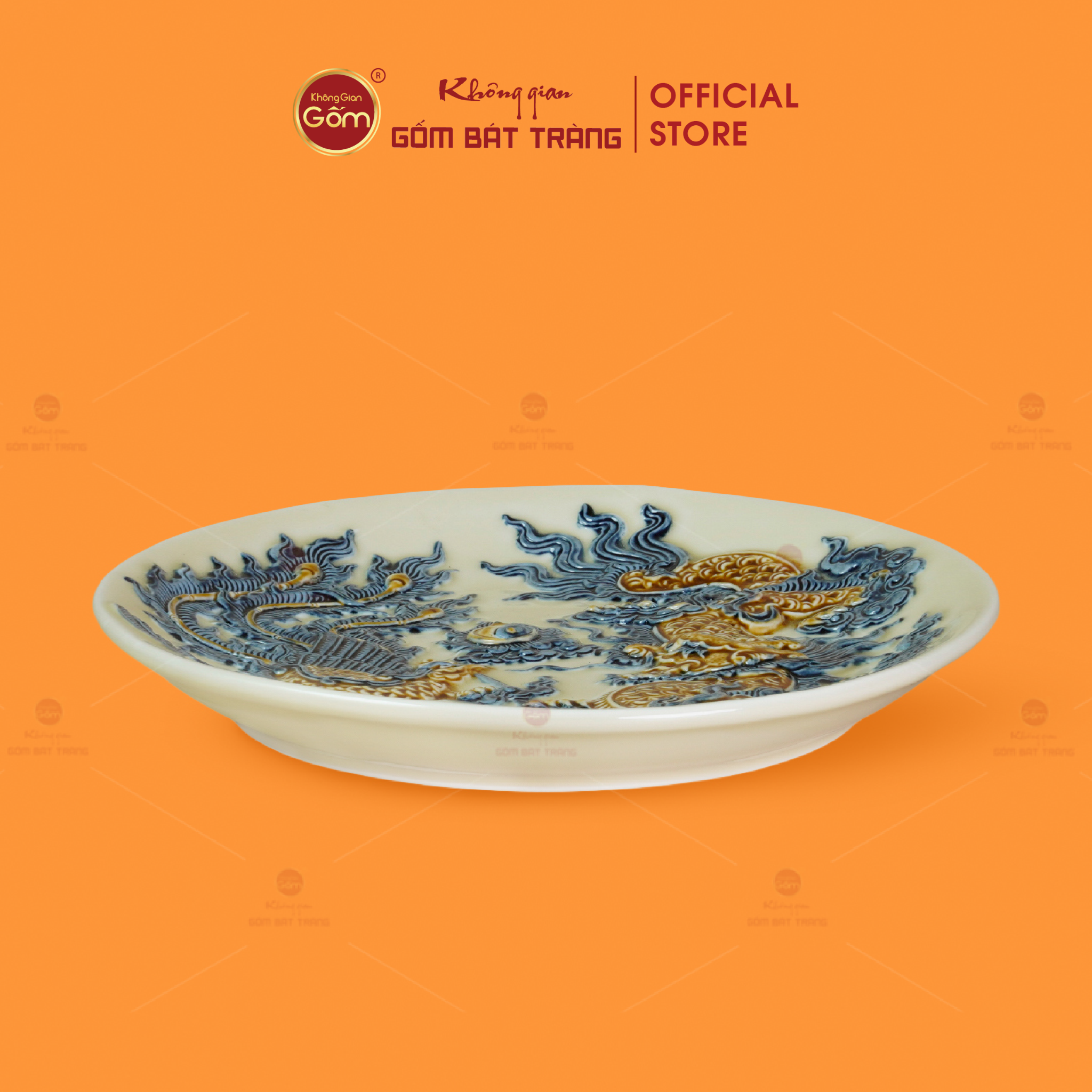 Sản phẩm này nổi bật với sắc men Hoàng Thổ trầm ấm, tượng trưng cho sự ổn định, sung túc và gắn kết, kết hợp cùng họa tiết Long Phụng Trình Tường (Rồng và Phượng), biểu tượng của sự hòa hợp, quyền quý và cát tường. Hoa văn Long Phụng trên mâm bồng là một sản phẩm nghệ thuật đòi hỏi sự tinh tế và kỹ thuật cao từ người nghệ nhân. Để tạo sự đặc sắc và làm nổi bật trên nền men Hoàng Thổ trang nghiêm, họa tiết này yêu cầu sự khéo léo trong quá trình kết hợp màu sắc, thường là vàng kim hoặc màu sắc tương phản nổi bật.