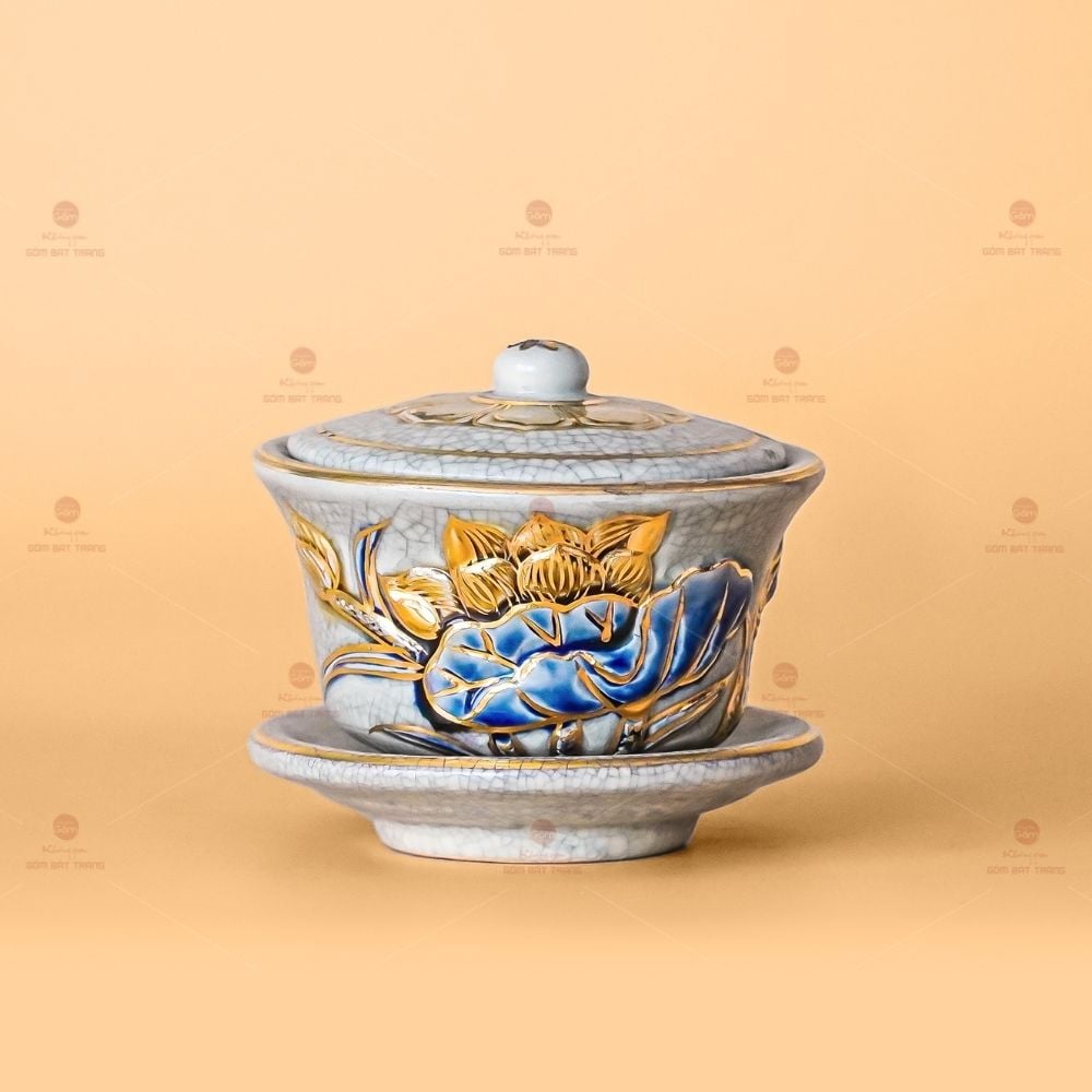 - Chất liệu: Gốm sứ men rạn họa tiết đắp nổi vẽ vàng 24K