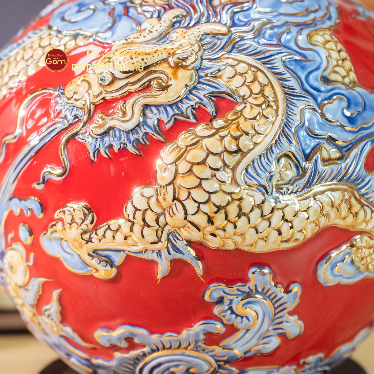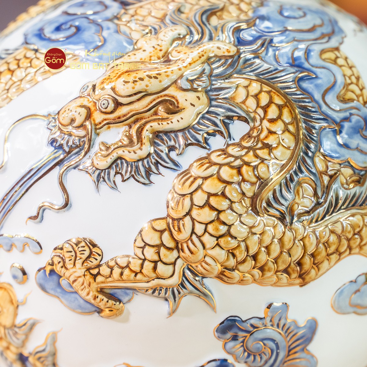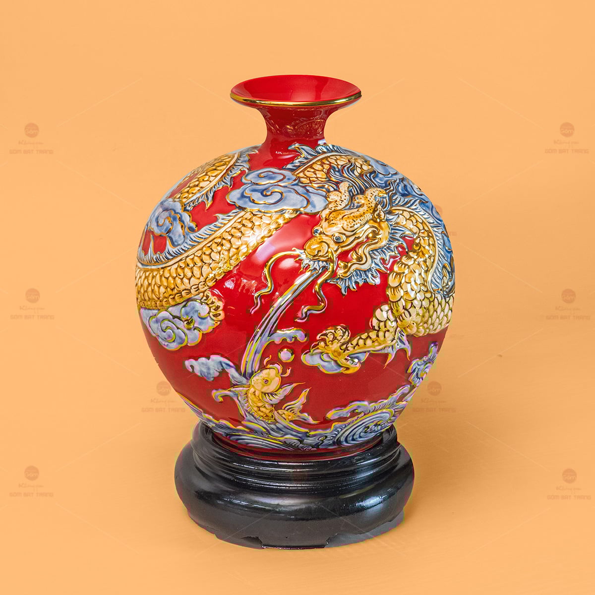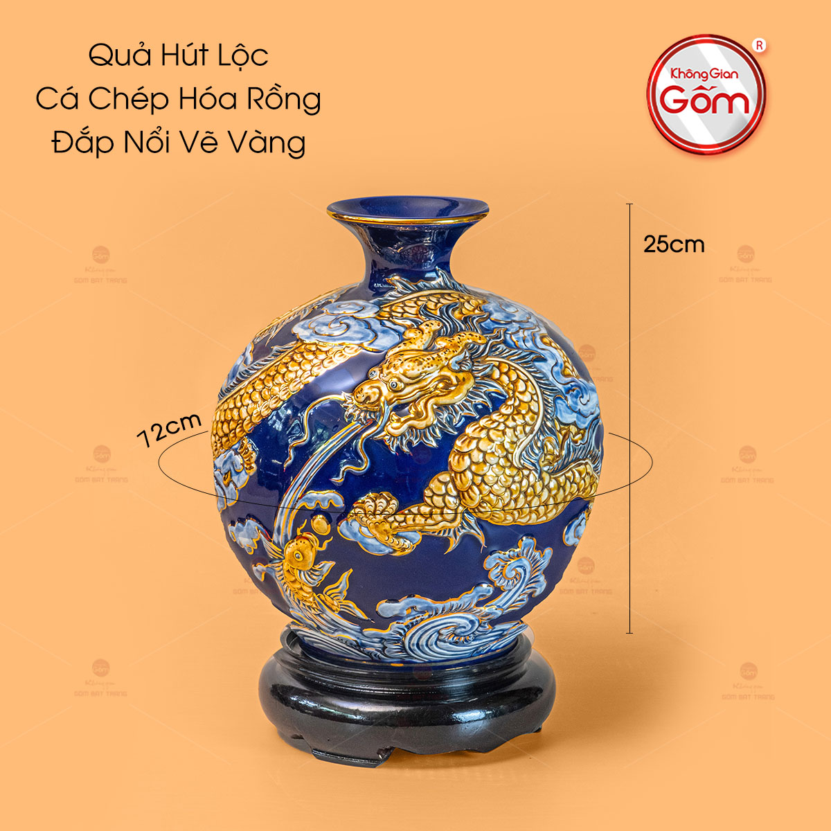 Mỗi chiếc bình được là một bức tranh sống động về điển tích Cá chép hóa rồng vẽ viền vàng tỉ mỉ. Từng đường nét trên thân rồng hiện lên chi tiết và đẹp mắt. Từ râu rồng đến vây rồng đều được thể hiện qua những nét vẽ uyển chuyển, linh hoạt trông như thật. Dù được làm thủ công nhưng sản phẩm vẫn có nhiều ưu điểm vượt trội: