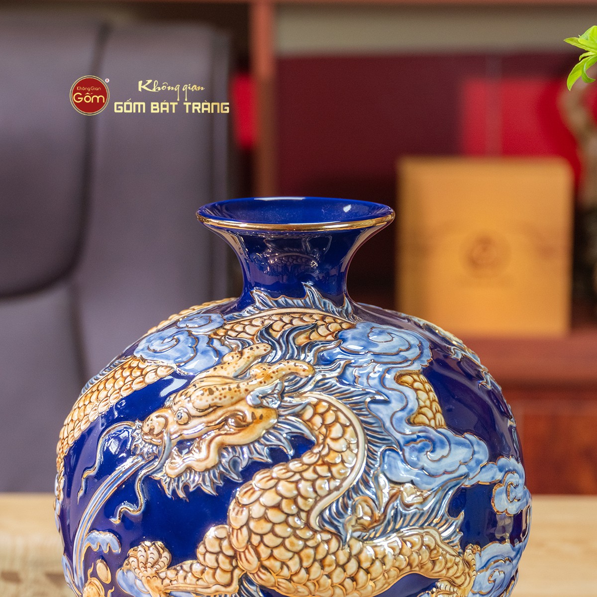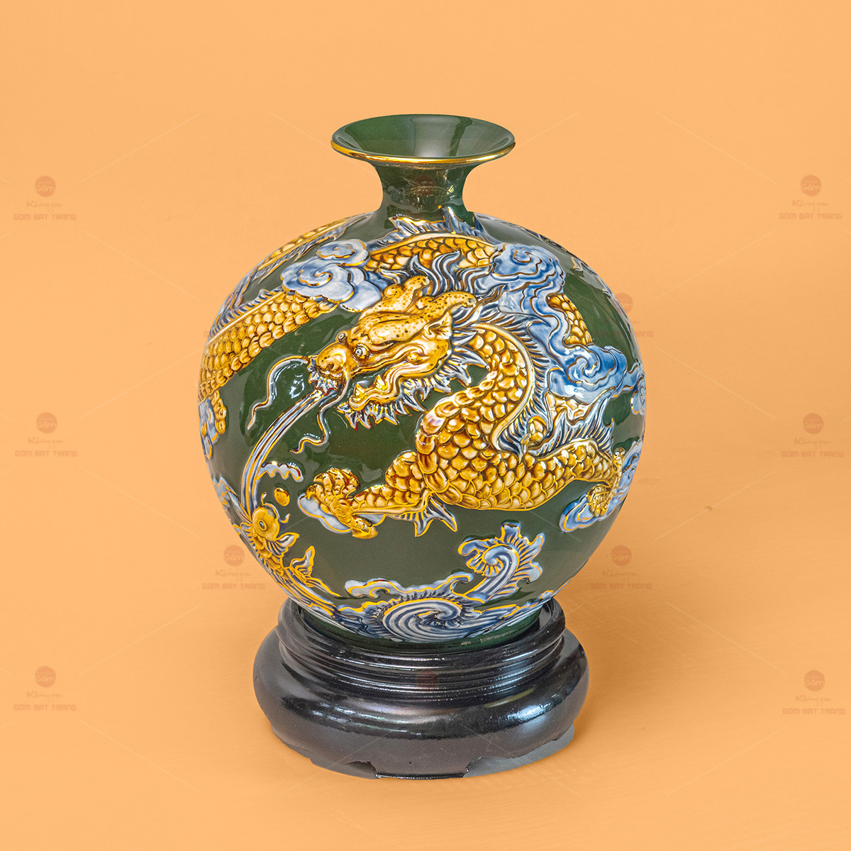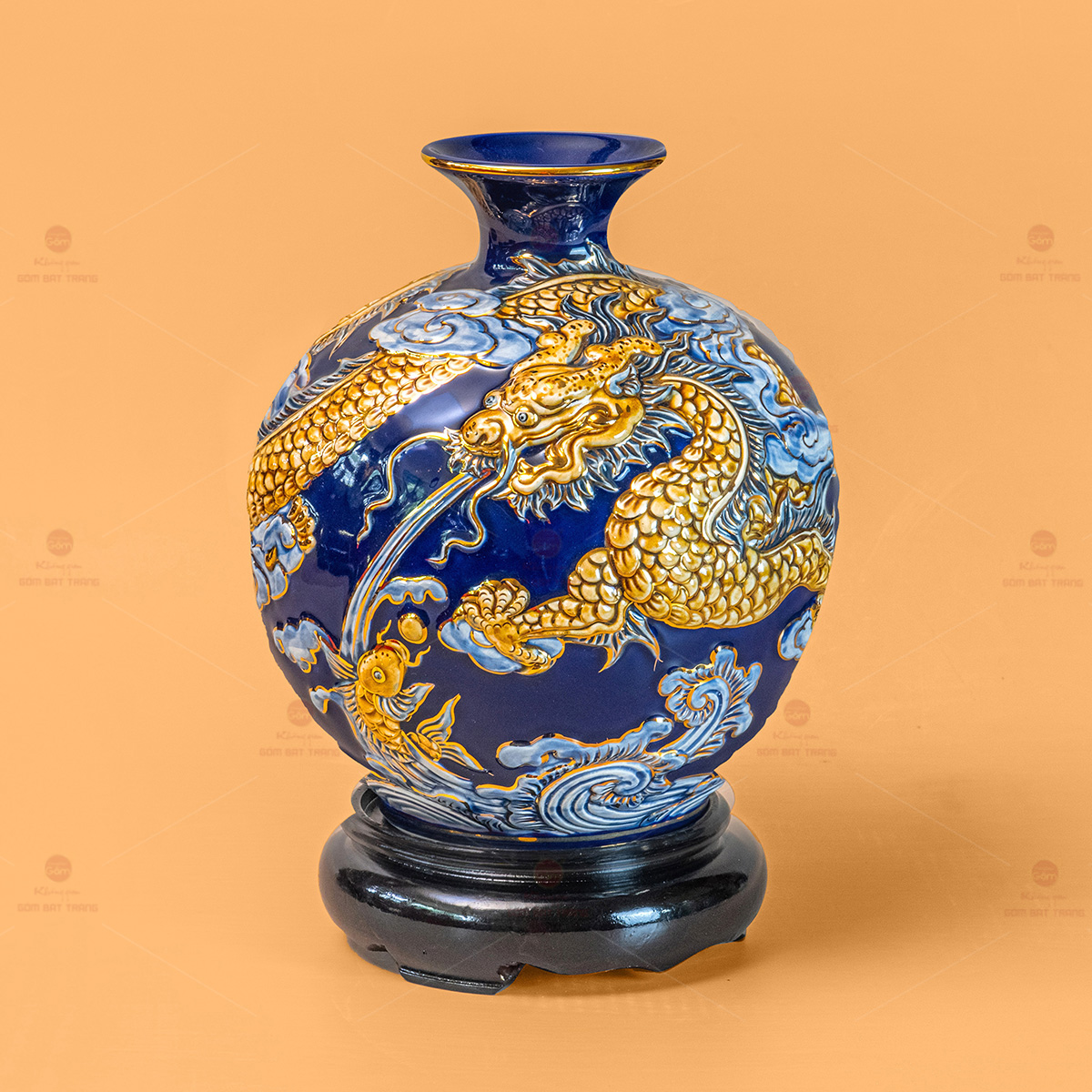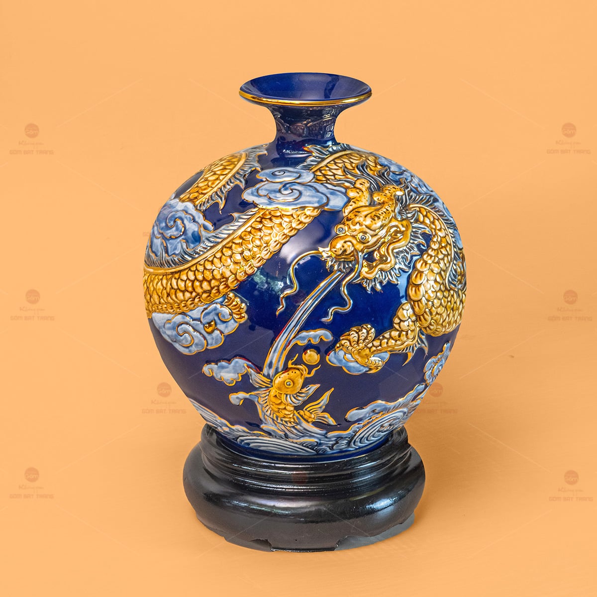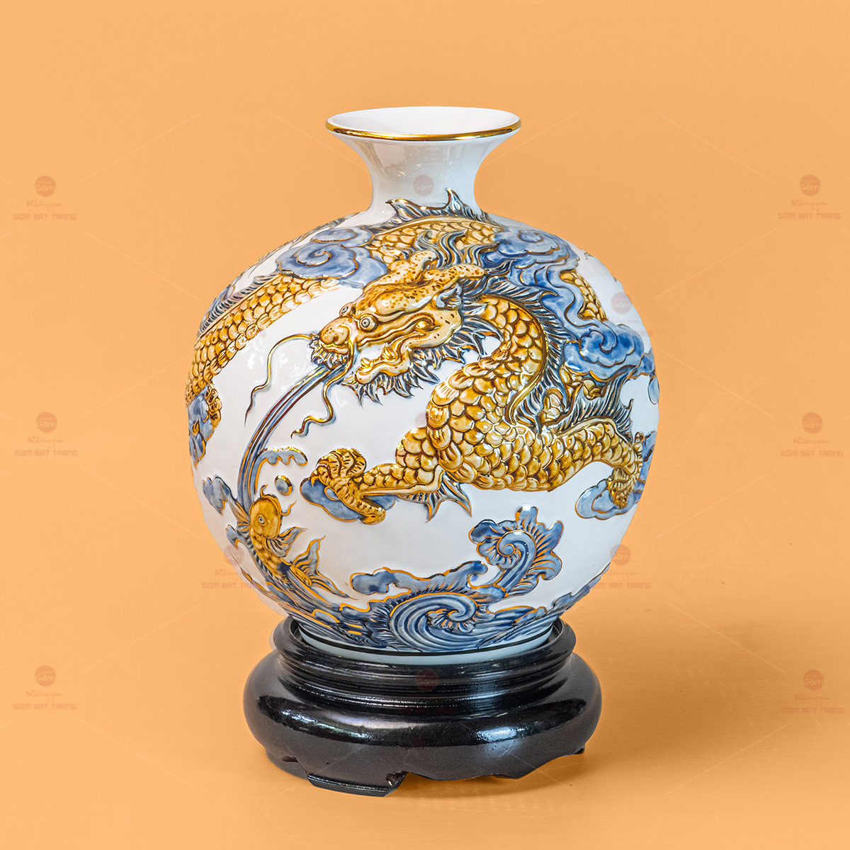 Mỗi chiếc bình được là một bức tranh sống động về điển tích Cá chép hóa rồng vẽ viền vàng tỉ mỉ. Từng đường nét trên thân rồng hiện lên chi tiết và đẹp mắt. Từ râu rồng đến vây rồng đều được thể hiện qua những nét vẽ uyển chuyển, linh hoạt trông như thật. Dù được làm thủ công nhưng sản phẩm vẫn có nhiều ưu điểm vượt trội: