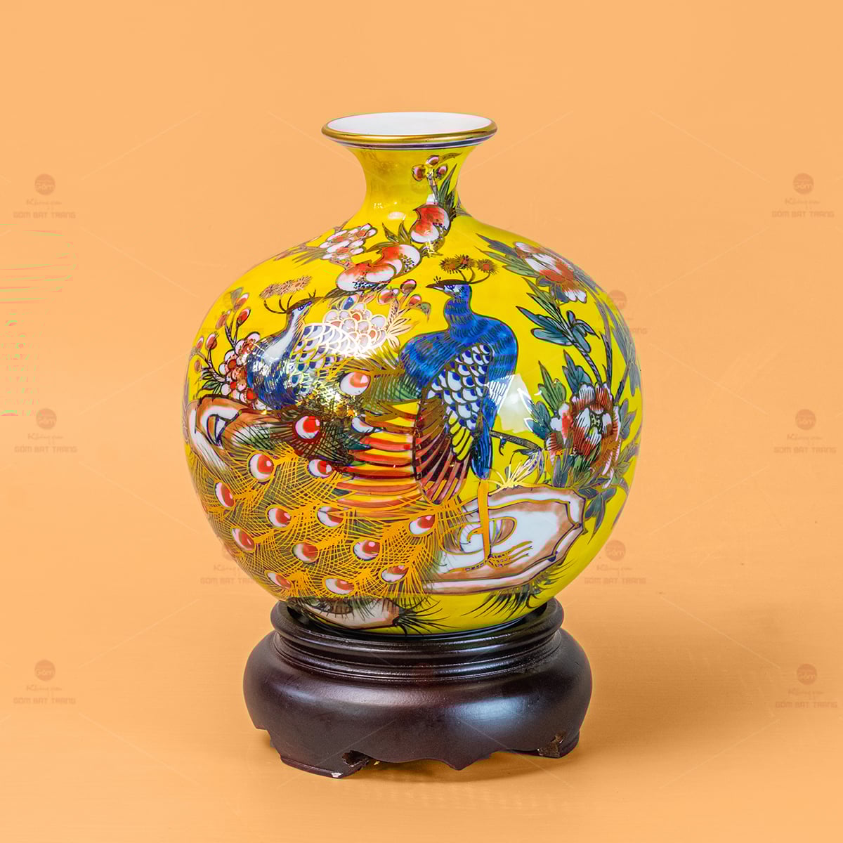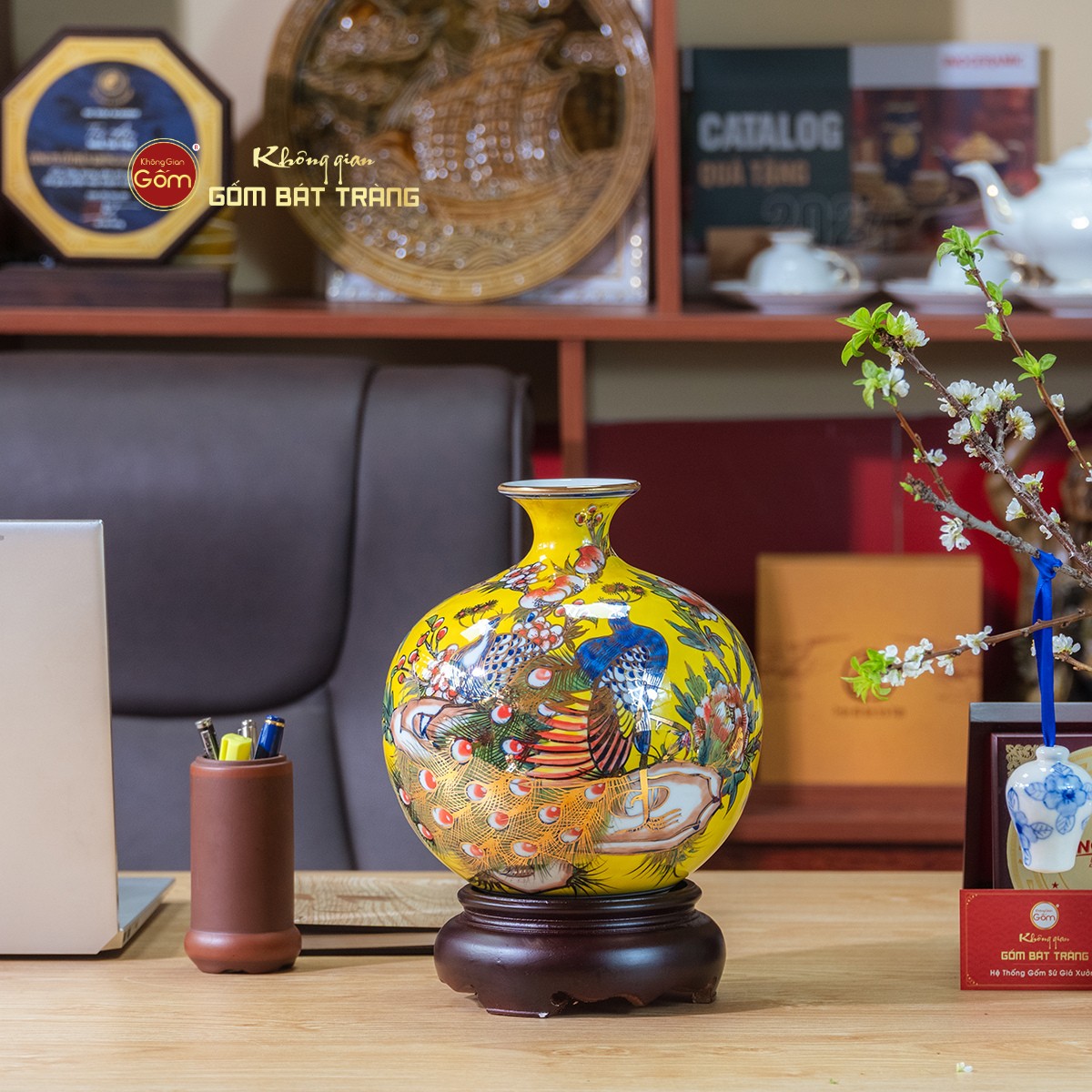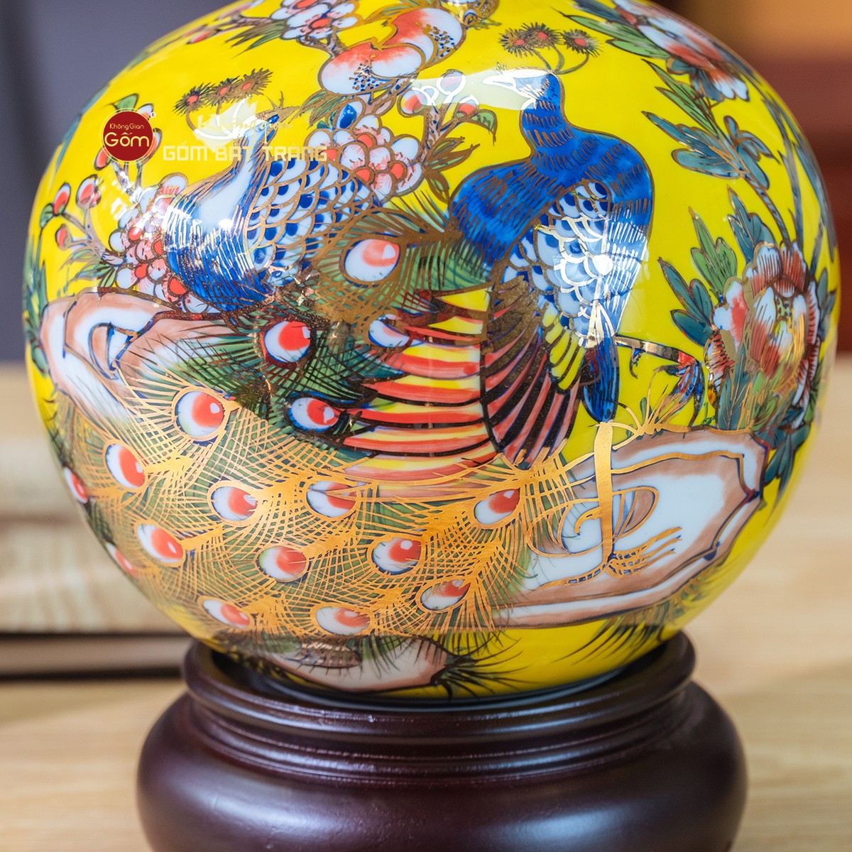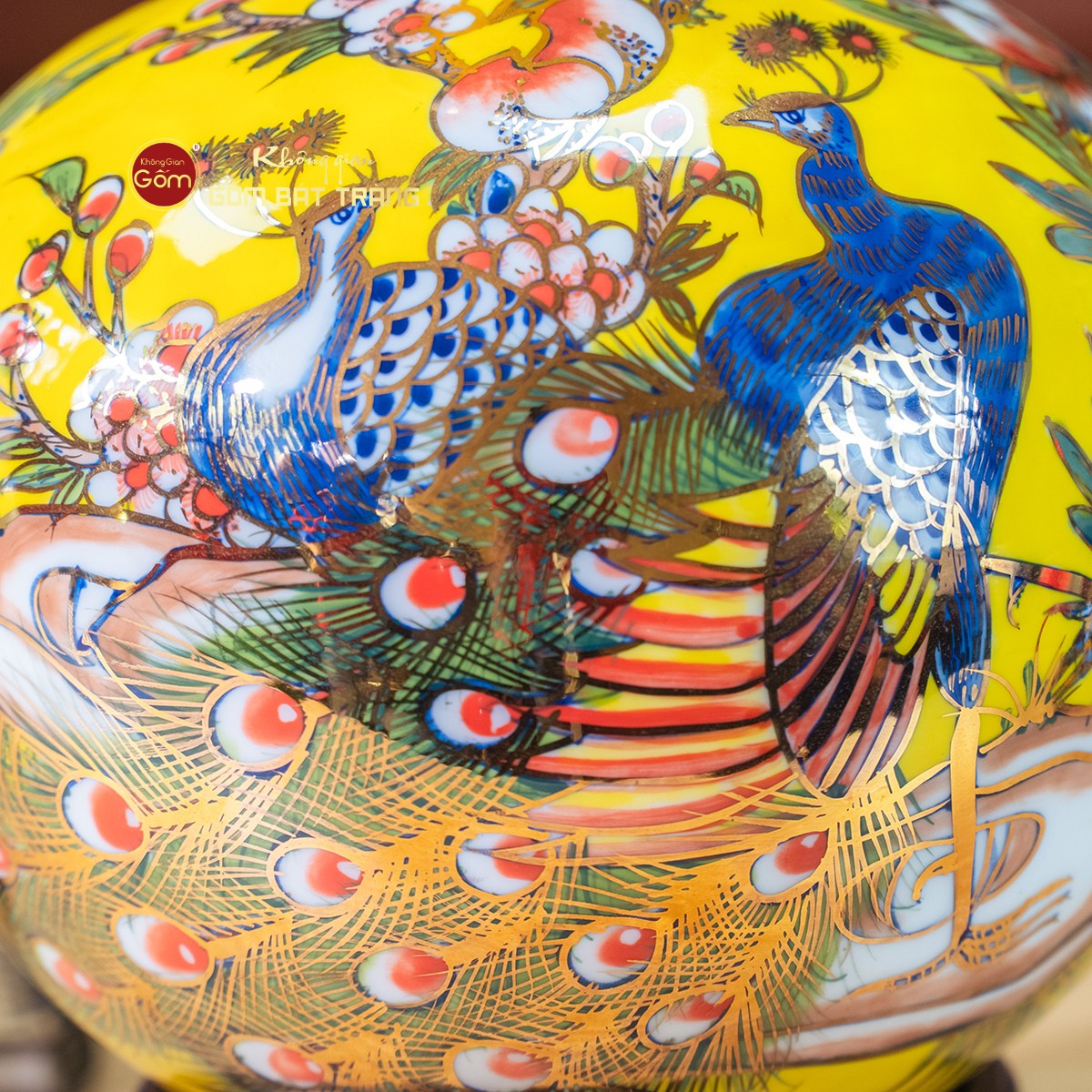 Sản phẩm nổi bật với những họa tiết tinh xảo được vẽ trên nền men vàng rực rỡ, kết hợp cùng phần cổ và miệng bình phủ men trắng viền vàng óng ánh, tạo nên một tổng thể hài hòa, sang trọng và đậm chất nghệ thuật. Được chế tác từ chất liệu gốm sứ Bát Tràng chính gốc, sản phẩm không chỉ sở hữu kết cấu bền vững, cứng cáp mà còn giữ được màu sắc tươi sáng, bền đẹp, không lo bong tróc hay phai nhạt theo thời gian.