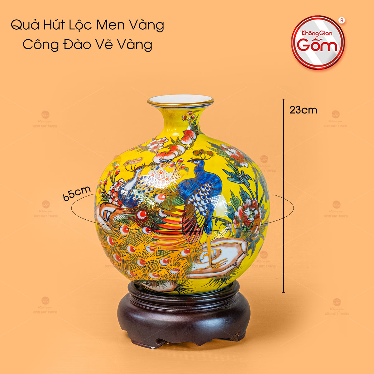 Quả Hút Lộc Men Vàng Công Đào Vẽ Vàng là chiếc bình gốm tài lộc có mẫu mã ấn tượng bởi họa tiết công đào phủ kín bề mặt của sản phẩm. Sản phẩm có tính thẩm mỹ cao nhờ những nét vẽ thủ công tỉ mỉ, sắc nét và thật sự có hồn. Chính vì vẽ đẹp thanh tao, tinh tế trên chất liệu gốm sứ lâu bền này mà quả hút lộc nói chung ngày càng được chuộng sử dụng. Nhiều người lựa chọn đặt bình hút tài lộc trong không gian phòng khách để khách đến chơi đều được chiêm ngưỡng và thưởng lãm vẻ đẹp tuyệt mỹ của. Dưới đây sẽ là những thông tin thú vị về sản phẩm.
