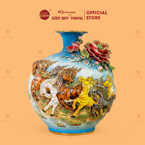 Quả Hút Lộc Men Xanh Mã Đáo Thành Công Đắp Nổi Vẽ Vàng là một tác phẩm nghệ thuật đầy tinh xảo. Với thiết kế đặc trưng của dòng bình hút tài lộc, sản phẩm không chỉ đóng vai trò như một món đồ trang trí mà còn được xem như biểu tượng mang lại sự thuận lợi và phát đạt trong công việc. Điểm nhấn nằm ở nền men xanh thanh lịch và sâu lắng, nơi tám chú ngựa mạnh mẽ đang phi nước đại được tạo hình 3D đắp nổi sống động, kết hợp cùng lớp phủ vàng kim 24K. Tất cả mang đến cảm giác tràn đầy sức mạnh, khát vọng chinh phục và thành công rực rỡ.