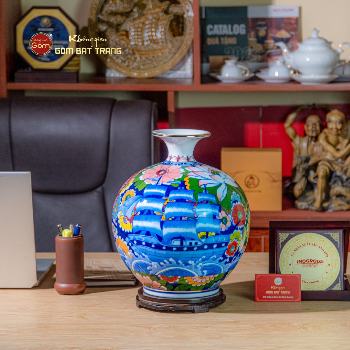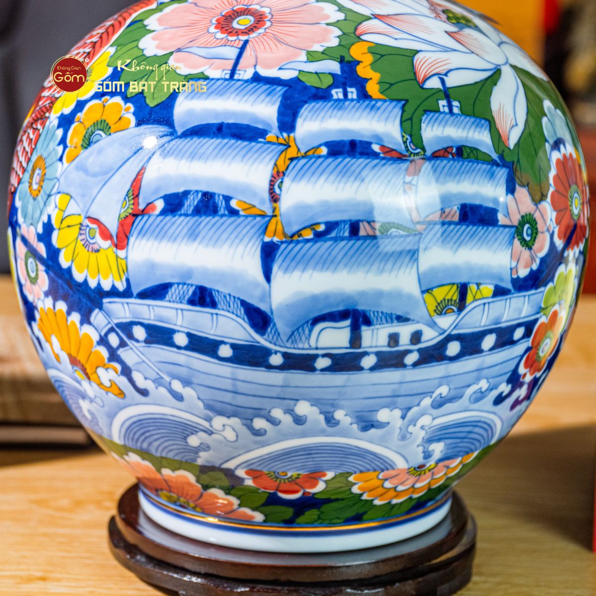 Quả Hút Lộc Niên Niên Hữu Dư Thuận Buồm là mẫu bình gốm có diện mạo độc đáo, có thể nói là có một hai không dễ tìm được mẫu thứ hai giống y hệt. Một mặt, quả hút lộc giúp tạo điểm nhấn cho không gian trưng bày, một mặt chiêu tài giữ lộc, mặt khác sản phẩm còn cho thấy gu thẩm mỹ của chủ sở hữu. Đây là dòng bình gốm phong thủy có nhiều ý nghĩa trong nghệ thuật decor nội thất.