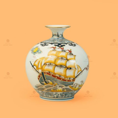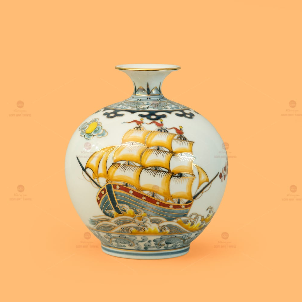 Họa tiết "Thuận Buồm Xuôi Gió": Hình ảnh con thuyền buồm no gió vươn ra biển lớn là biểu tượng của sự thuận lợi, thành công, mọi việc hanh thông, "tiền vào như nước". Họa tiết được vẽ vàng 24K, làm tăng thêm sự sang trọng và giá trị của sản phẩm.