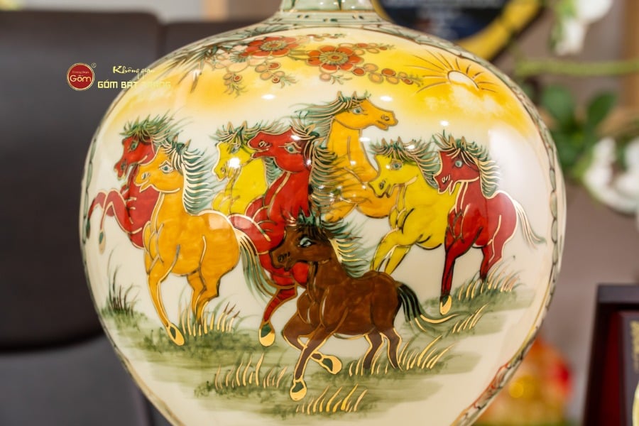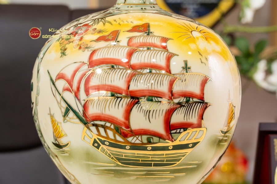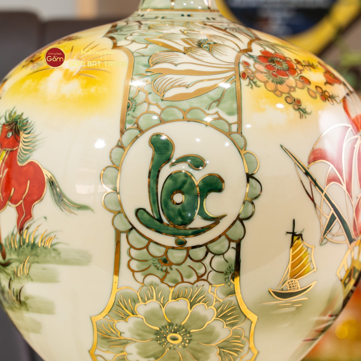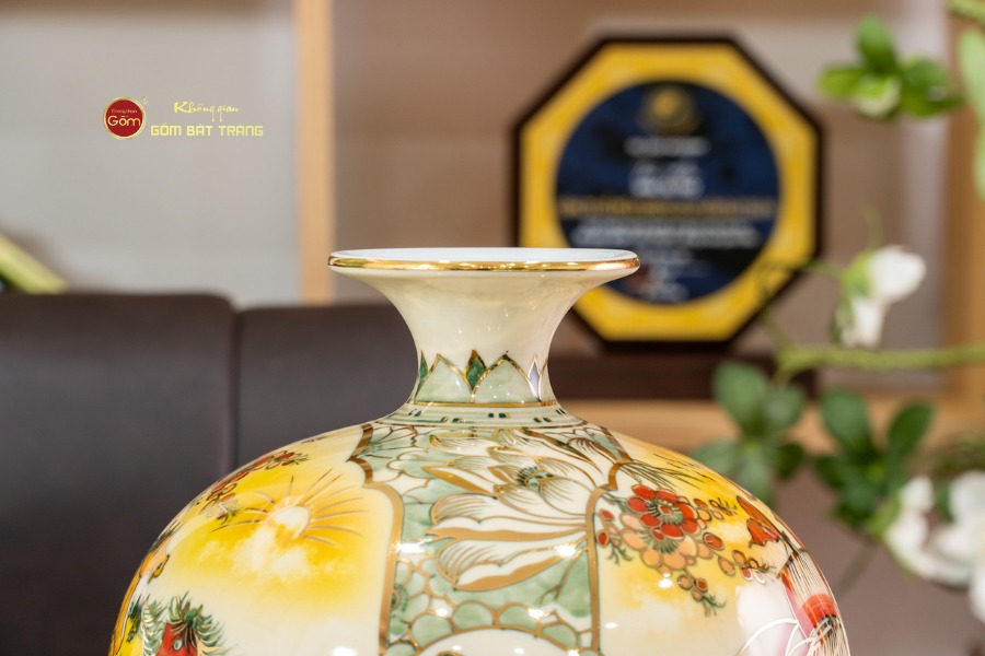 Sản phẩm được chế tác từ gốm sứ cao cấp Bát Tràng, trải qua quy trình nung ở nhiệt độ cao giúp xương gốm cứng chắc, bền màu theo thời gian. Lớp men huỳnh bảo nổi bật với sắc vàng ấm áp, sang trọng, tạo cảm giác ấm cúng và thịnh vượng.