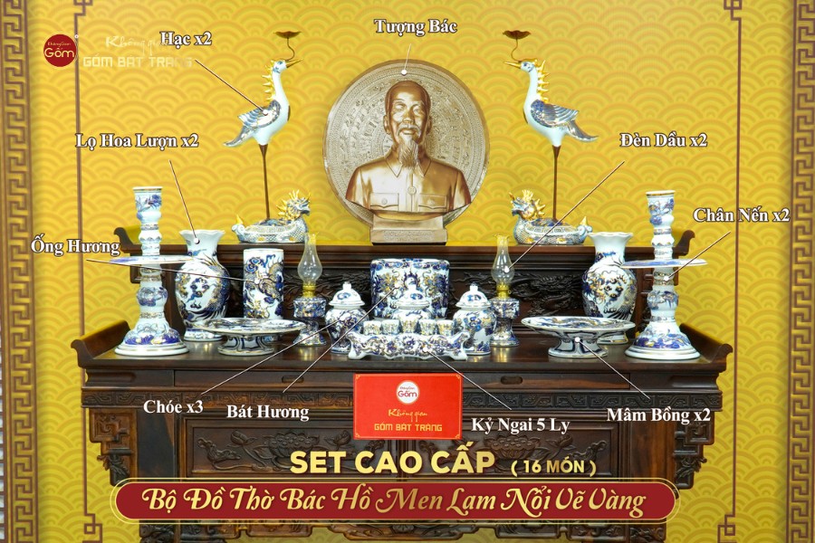 - Tên sản phẩm: [Set Cao Cấp] Bộ Đồ Thờ Bác Hồ Men Lam Nổi Vẽ Vàng (16 món)