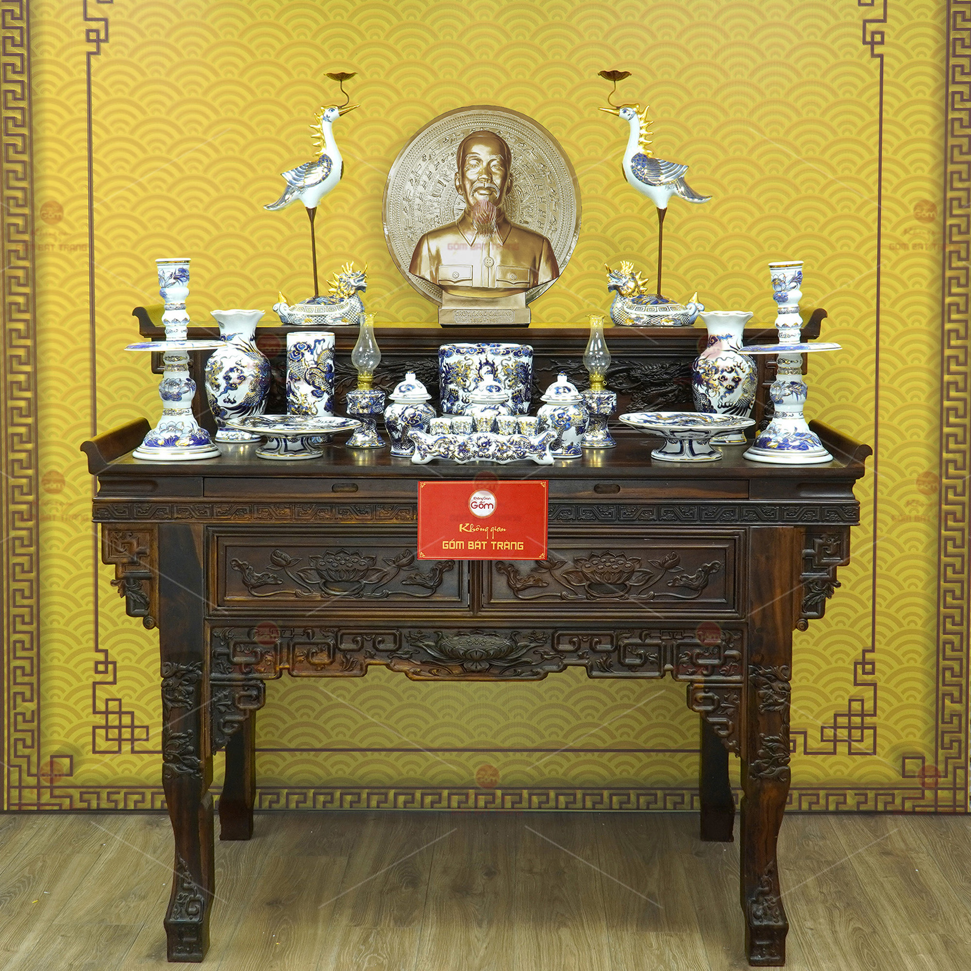 [Set Cao Cấp] Bộ Đồ Thờ Bác Hồ Men Lam Nổi Vẽ Vàng (16 món)