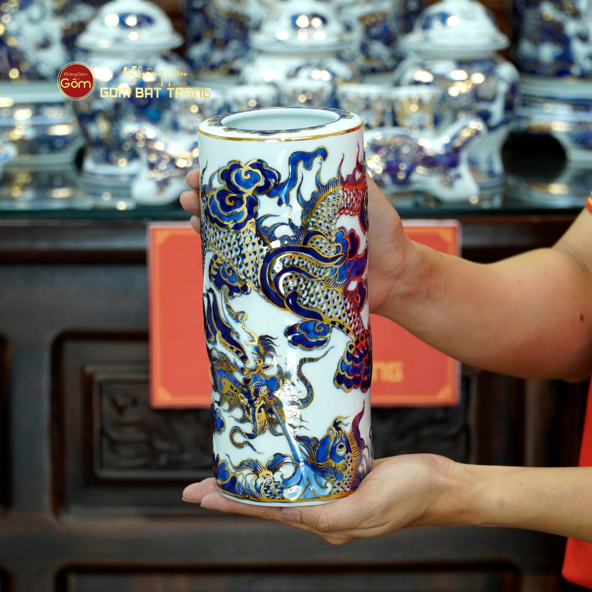 Nổi bật với sắc men lam cổ điển và đường vẽ vàng tinh xảo, bộ đồ thờ mang vẻ đẹp sang trọng, trang nghiêm và đầy tính nghệ thuật. Trên nền lam trầm mặc, từng họa tiết rồng – phượng, hoa sen, mây trời… được vẽ thủ công tỉ mỉ bằng vàng thật, tạo nên chiều sâu và sự quý phái hiếm có. Màu lam tượng trưng cho sự thanh tịnh, bền vững; sắc vàng lại biểu trưng cho trí tuệ và phúc lành – hai yếu tố hòa quyện làm nên linh khí của bàn thờ Bác Hồ.