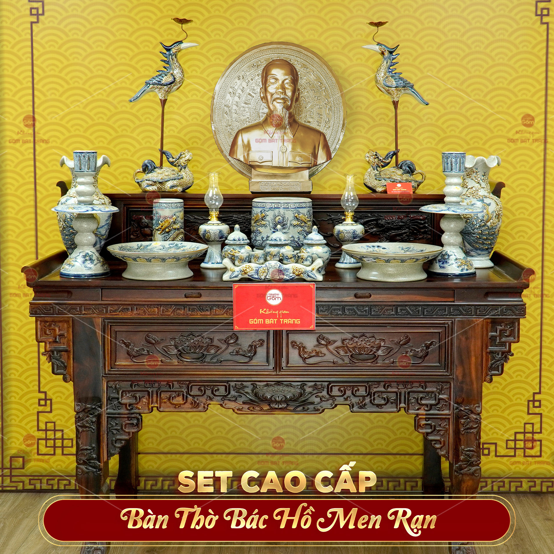 Bộ sản phẩm gồm 16 món được lựa chọn và bài trí theo nguyên tắc đối xứng, hài hòa, tạo không gian thờ cúng hoàn hảo về cả hình thức lẫn nội dung. Tượng Bác bằng đồng đúc tinh xảo đặt trung tâm, hai bên là đôi hạc men rạn đứng trên đài cao vươn cổ lên trời - biểu tượng của sự thanh cao, trường thọ và ước vọng bay cao cùng lý tưởng cách mạng của Người.