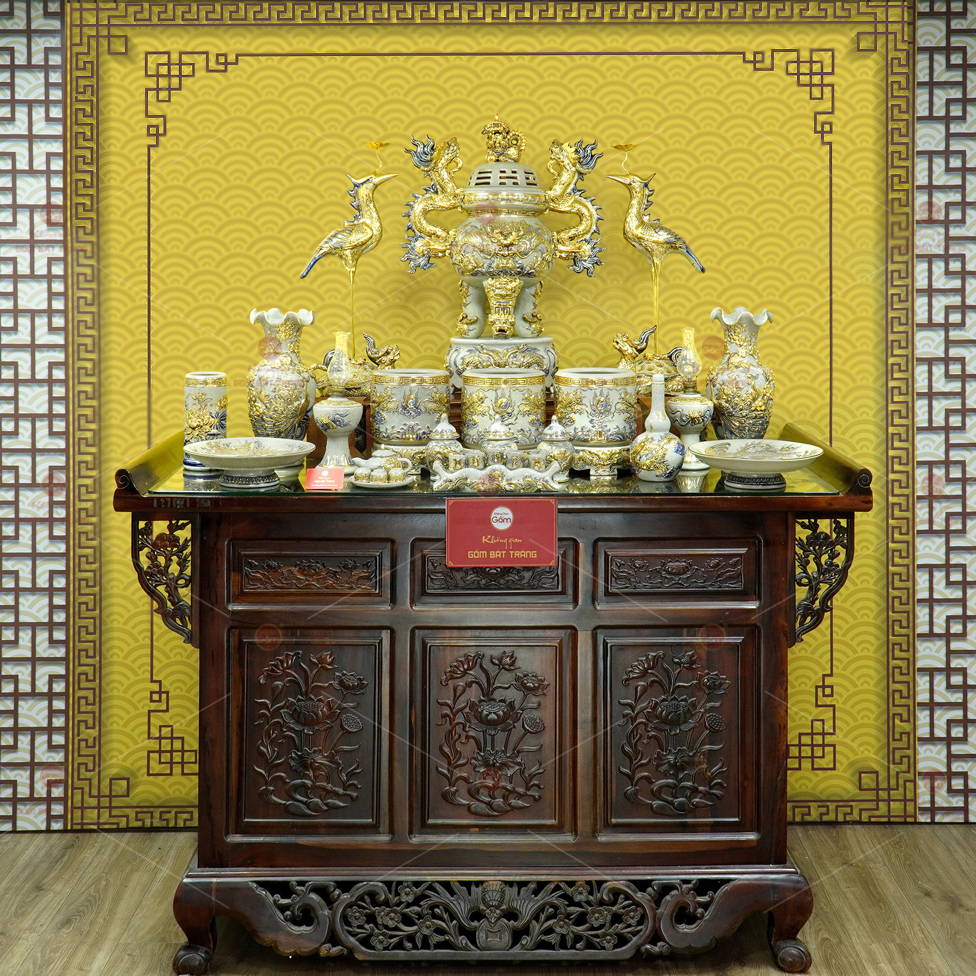 Ưu điểm nổi bật của bộ đồ thờ này là vẻ đẹp cổ kính mà không cũ kỹ, tinh xảo nhưng vẫn gần gũi, đậm hồn Việt. Lớp men rạn giúp sản phẩm có độ bền màu vượt trội, không phai theo năm tháng. Các chi tiết hoa văn, đường viền, họa tiết đều được tính toán cân đối theo chuẩn phong thủy, đảm bảo hài hòa, tôn nghiêm và thuận lợi trong quá trình bài trí.