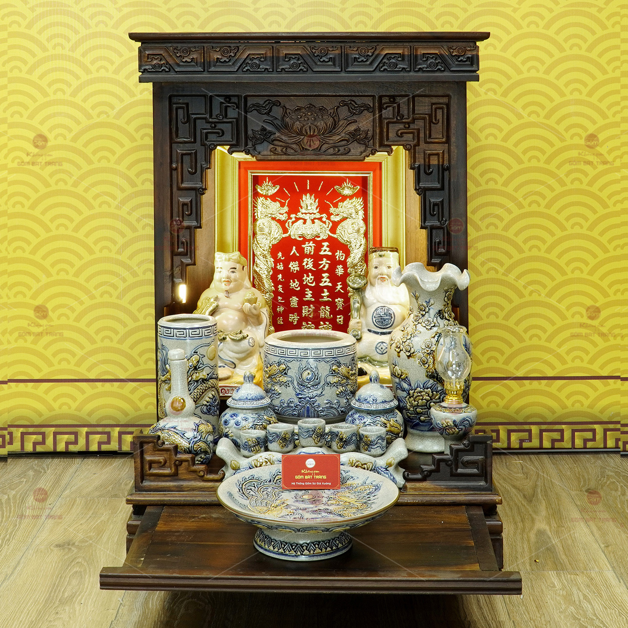 Bộ sản phẩm gồm tượng Thần Tài và Thổ Địa, bài vị, bát hương, mâm bồng, lọ hoa, ống hương, nậm rượu, chén thờ, đèn dầu... Tất cả đều được chế tác tinh xảo với họa tiết rồng, phượng, hoa sen, dơi ngậm thọ – những biểu tượng thiêng liêng trong văn hóa Á Đông, mang ý nghĩa cầu mong phú quý, thịnh vượng và bình an.