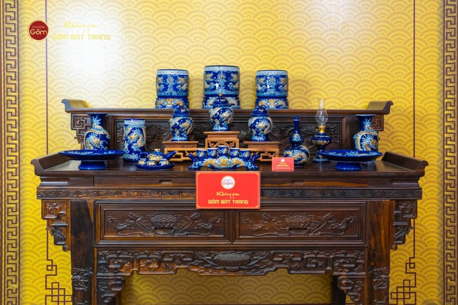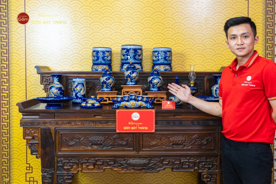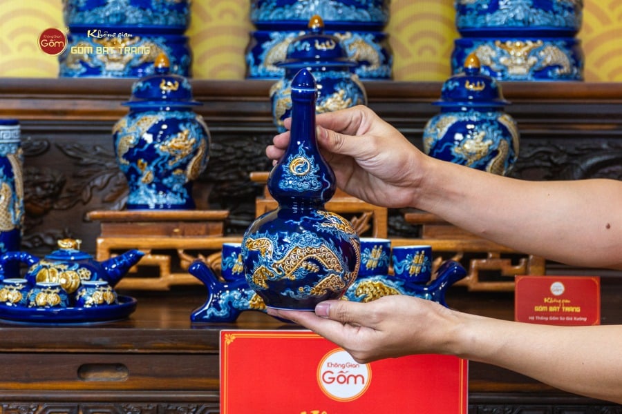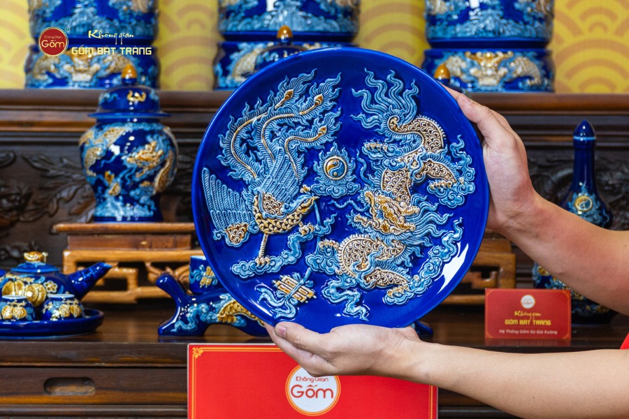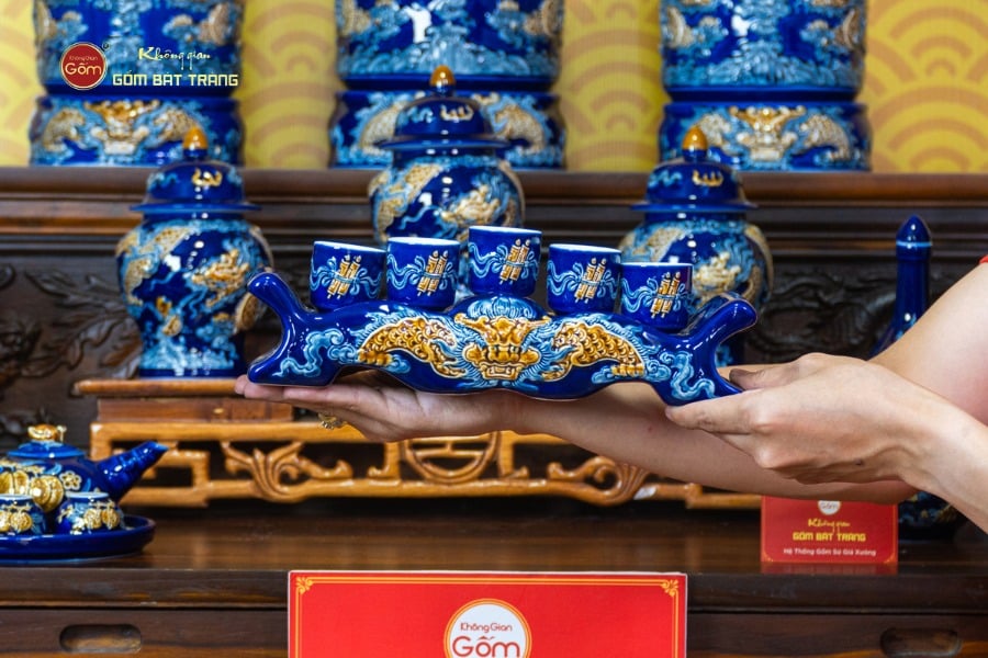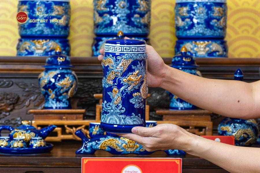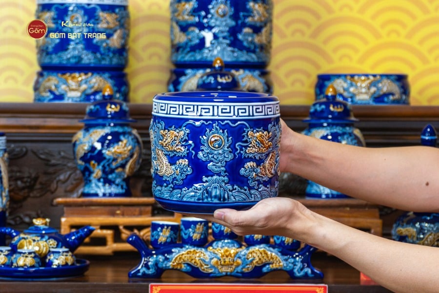 Trên nền men xanh Coban sang trọng, các món đồ được trang trí với họa tiết truyền thống tinh tế: