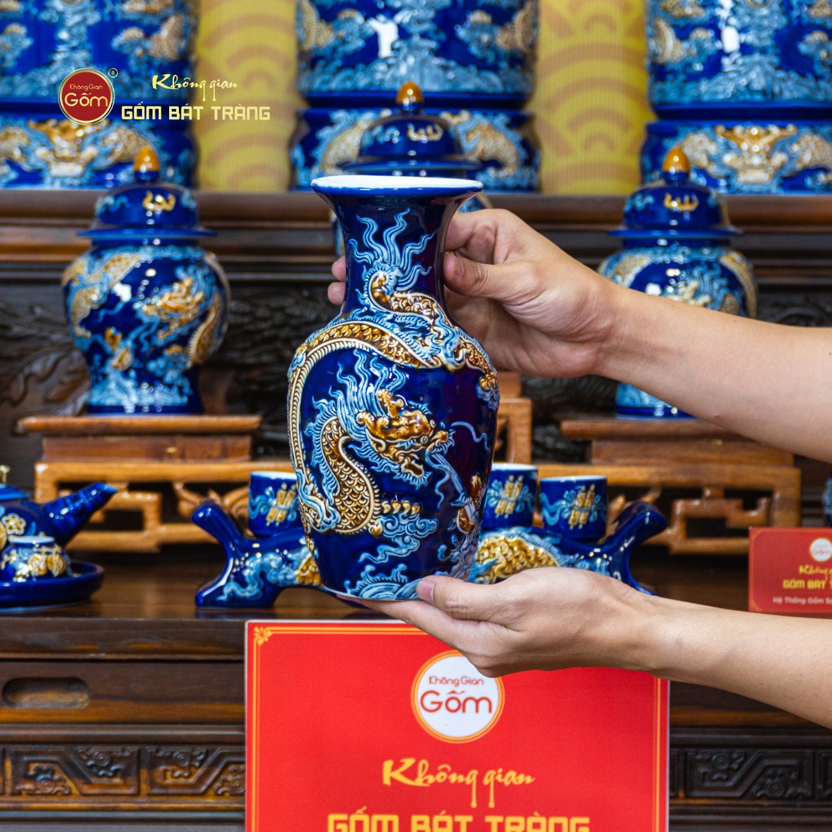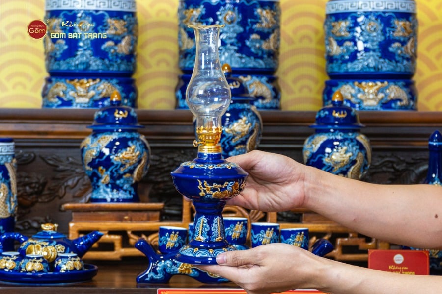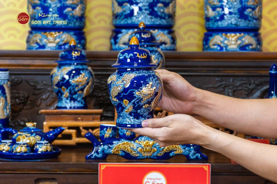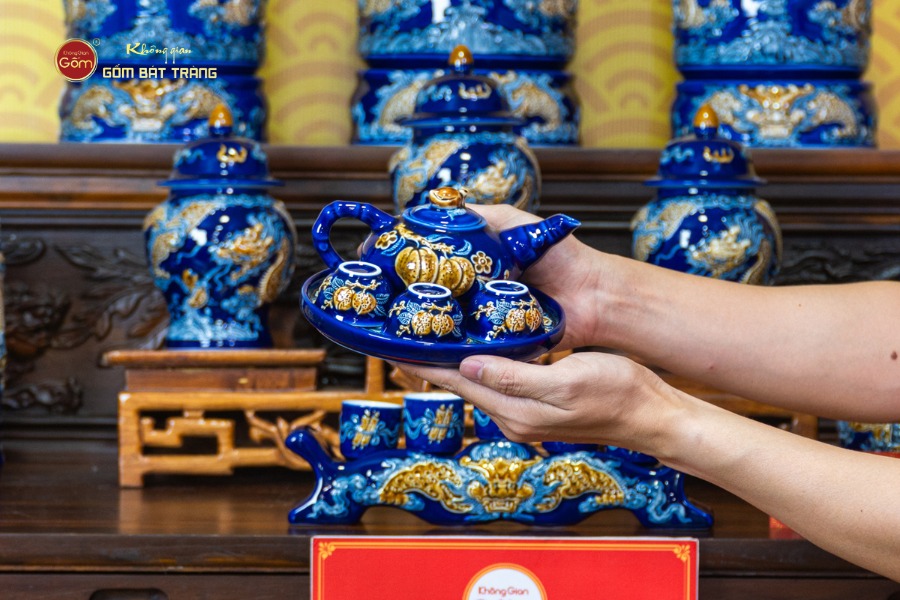 Màu xanh Coban mang sắc thái hiện đại nhưng vẫn giữ được nét cổ kính, đặc biệt phù hợp với gia chủ mệnh Thủy hoặc mệnh Mộc. Màu men xanh Coban tạo nên vẻ đẹp thanh lịch, sâu lắng và đầy sức sống cho bộ đồ thờ. Lớp men có độ trong và độ bóng cao, gợi liên tưởng đến bầu trời bao la và đại dương tĩnh lặng, tạo cảm giác bình an và linh thiêng phù hợp với không gian thờ tự của gia đình.