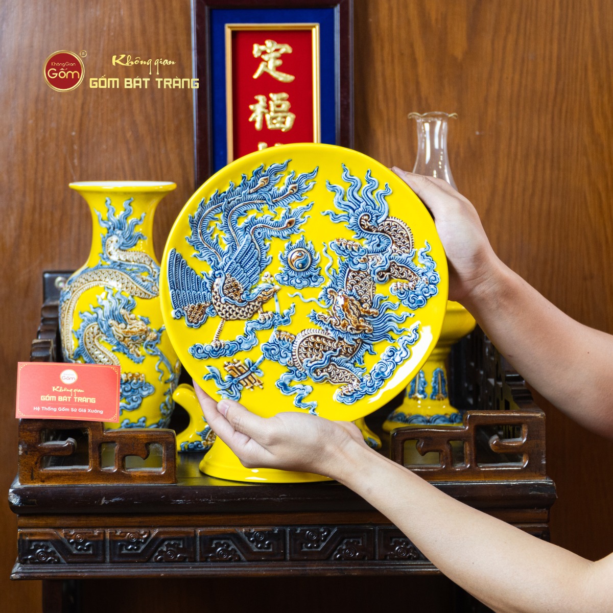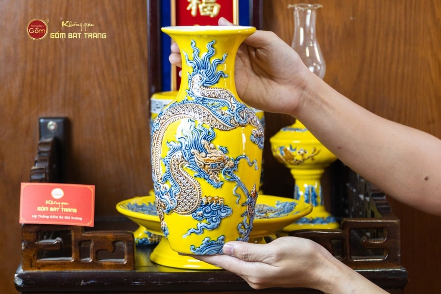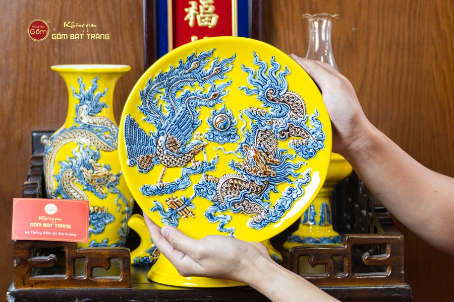 Điểm nhấn lớn nhất chính là lớp men vàng rực rỡ. Sắc vàng của gốm sứ Bát Tràng không quá chói mà mang nét đằm thắm, sang trọng, có độ bóng sâu. Để đạt được sắc màu chuẩn vương giả này, sản phẩm phải được nung ở nhiệt độ trên 1200°C, giúp bề mặt men lì, cứng cáp và không bị ảnh hưởng bởi hơi nóng hay dầu mỡ từ việc nấu nướng.