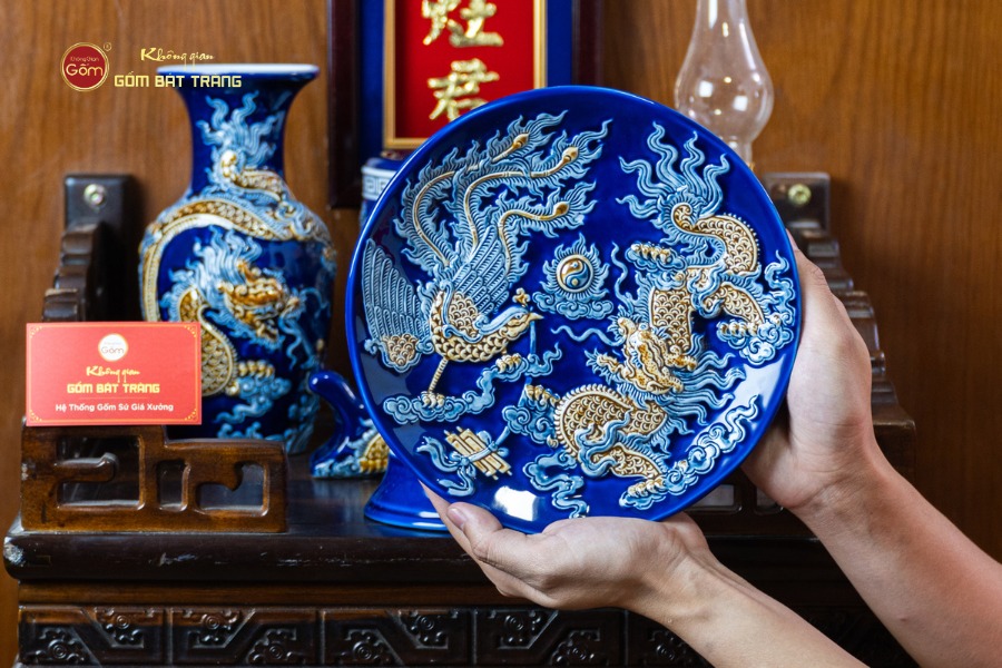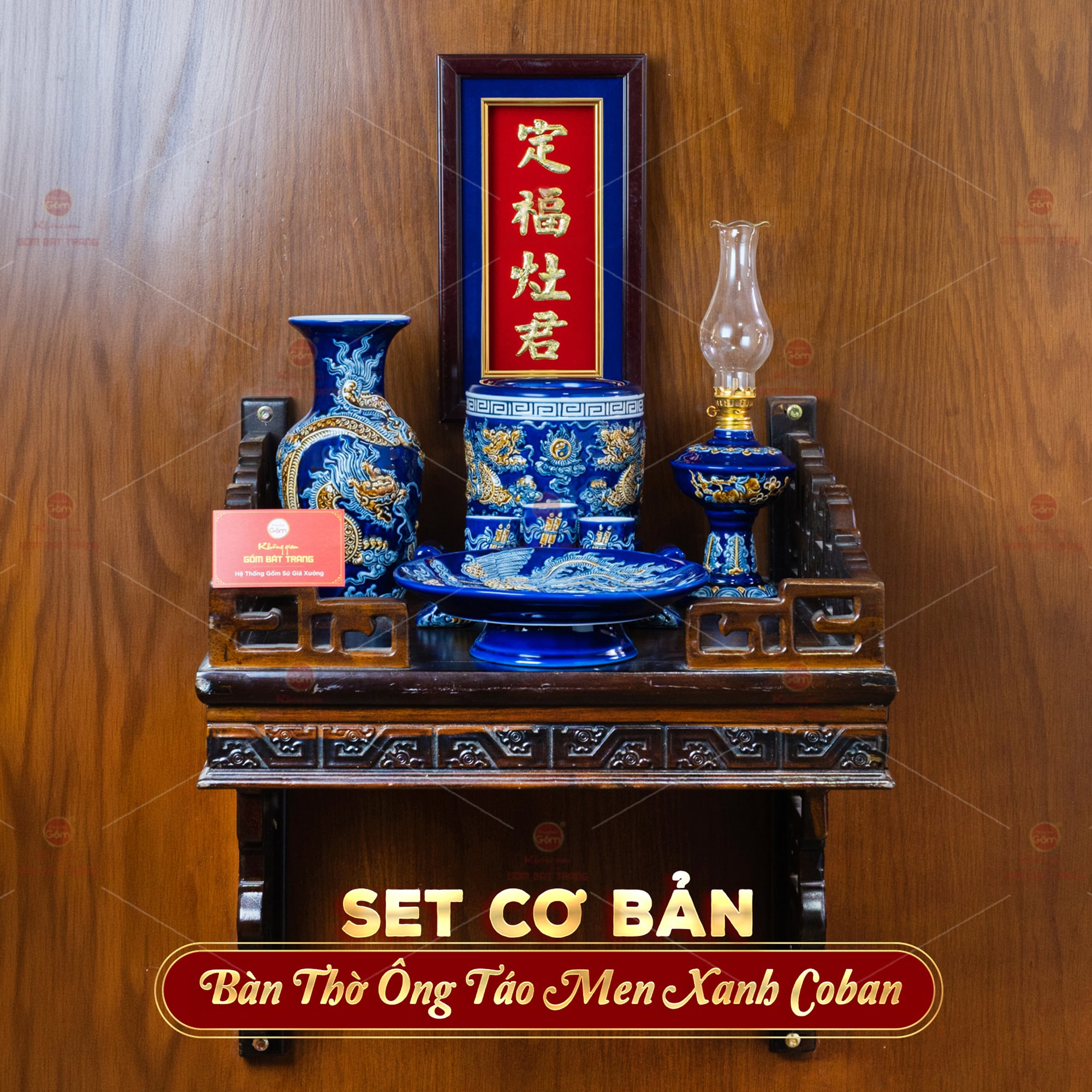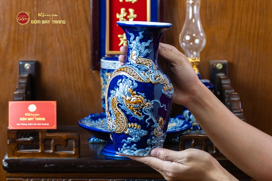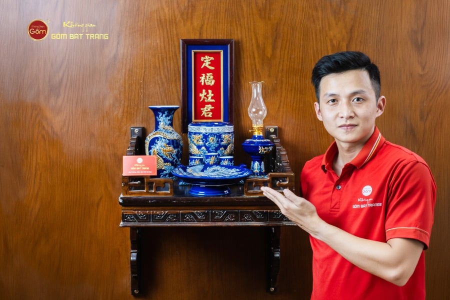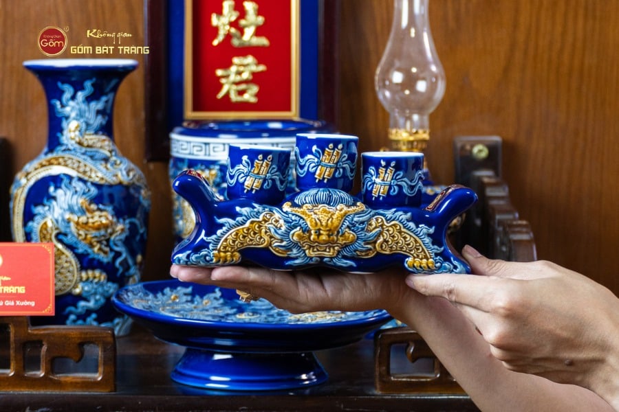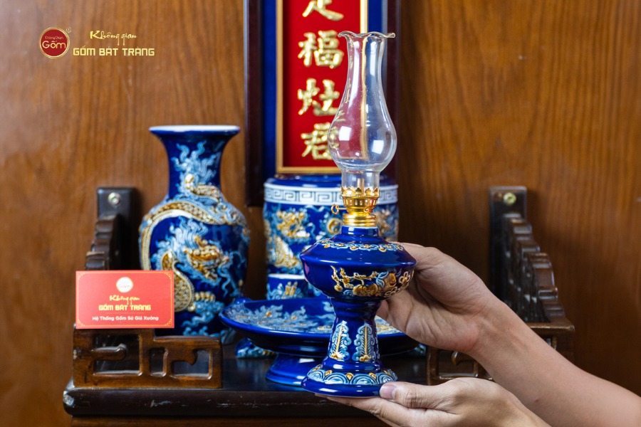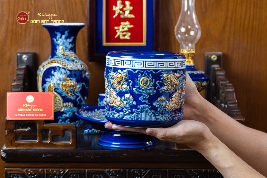 Lớp men xanh Coban bền màu theo thời gian, được các nghệ nhân vẽ thủ công tỉ mỉ với họa tiết rồng phượng, hoa sen, những biểu tượng mang ý nghĩa linh thiêng và thu hút vượng khí. Bát hương được tạo hình cân đối, miệng rộng, lòng sâu giúp việc thắp hương được thuận tiện và trang nghiêm. Các vật phẩm khác như lọ hoa, mâm bồng được thiết kế hài hòa, giúp gia chủ dễ dàng bài trí dù không gian bếp hẹp hay rộng.