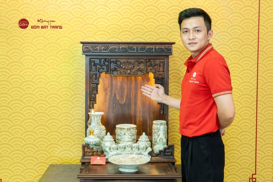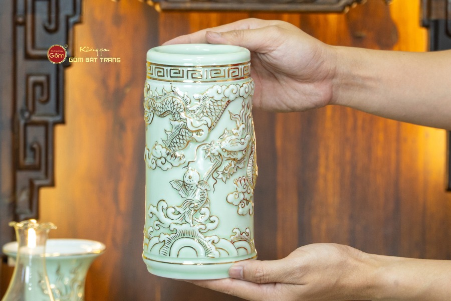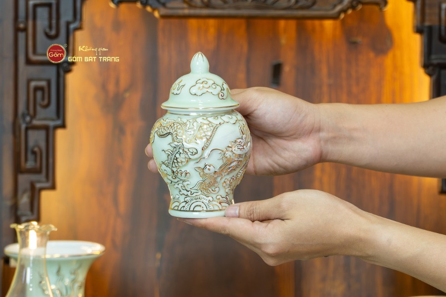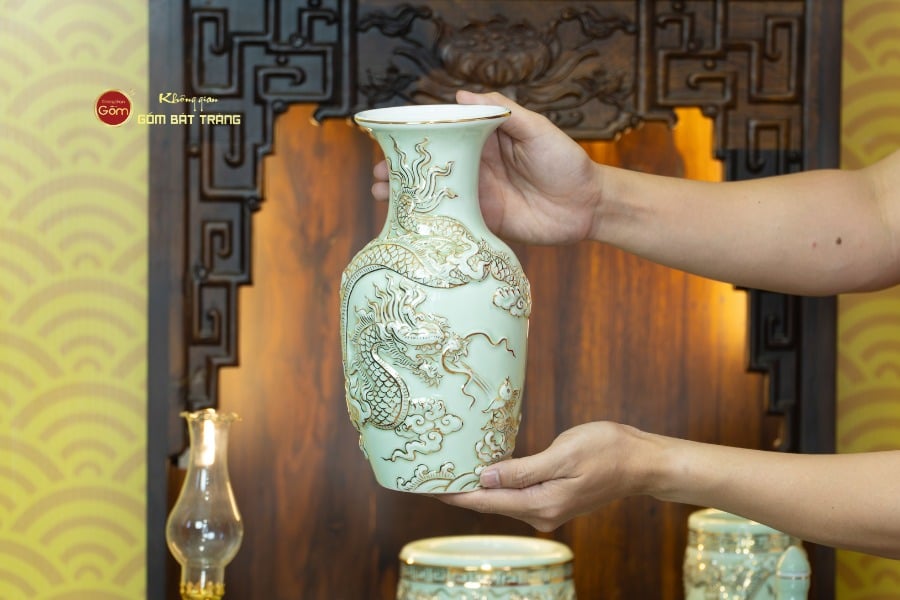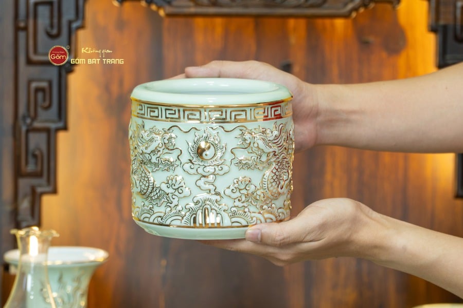 Sắc men hoàng tộc góp phần làm nổi bật ánh kim lấp lánh của vàng ròng, mang lại hiệu ứng thị giác vô cùng quý phái và trang nhã khi ánh sáng từ đèn bàn thờ chiếu vào. Các nghệ nhân của làng gốm Bát Tràng đã khéo léo lồng ghép các hình ảnh biểu trưng cho sự thịnh vượng và phú quý vào từng chi tiết.