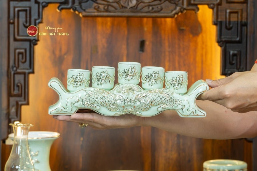 Toàn bộ sản phẩm được chế tác từ đất sét trắng tinh khiết, trải qua quá trình nung ở nhiệt độ cao trên 1280°C, tạo nên chất gốm cứng cáp, bền bỉ theo thời gian. Điểm đặc biệt đáng giá nhất nằm ở các họa tiết thủ công được vẽ tay tỉ mỉ bằng vàng 24K trên lớp men hoàng tộc sang trọng.