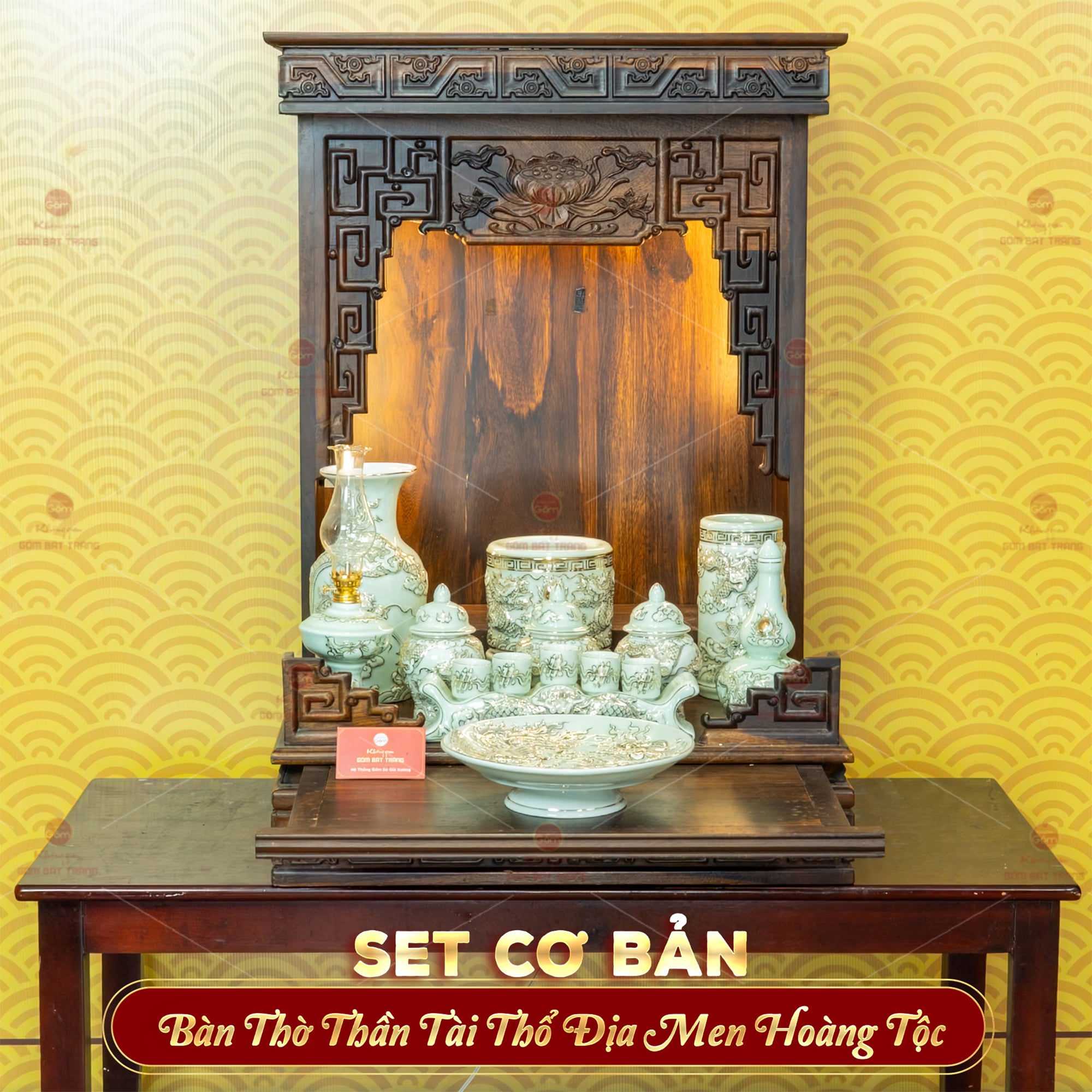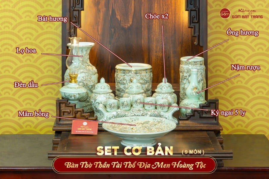 [Set Cơ Bản] Bộ Đồ Thờ Thần Tài Thổ Địa Men Hoàng Tộc Vẽ Vàng (10 món)