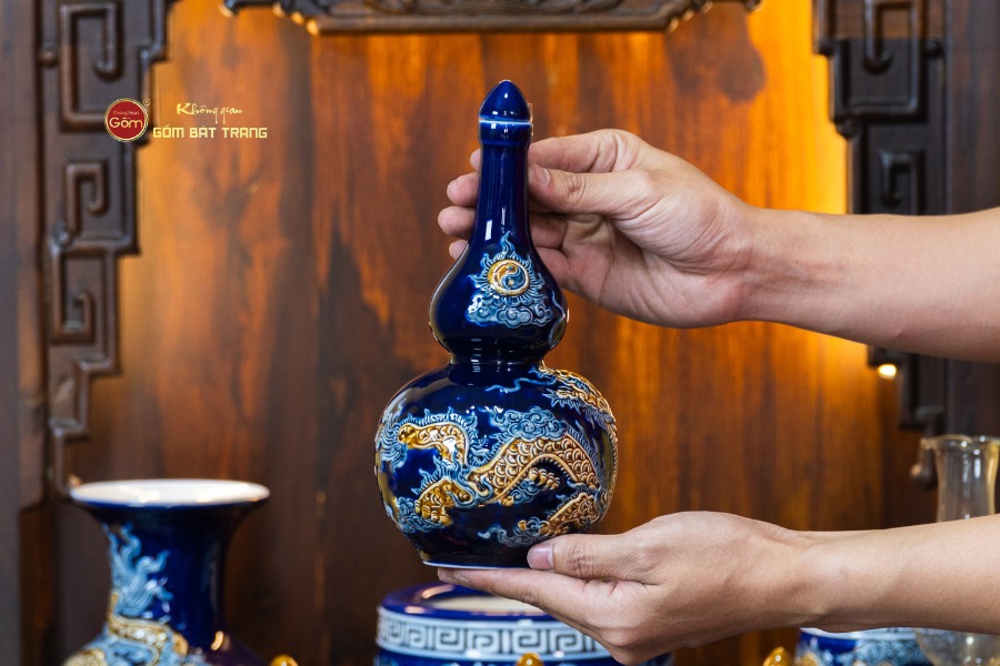 Vẻ đẹp trang nhã: Màu men xanh Coban tạo nên vẻ đẹp thanh thoát, uy nghiêm và đầy sức sống cho bộ đồ thờ. Lớp men có độ bóng cao, gợi liên tưởng đến sự bao la của bầu trời và biển cả, giúp bàn thờ Thần Tài luôn mang cảm giác nhẹ nhàng, thông suốt.