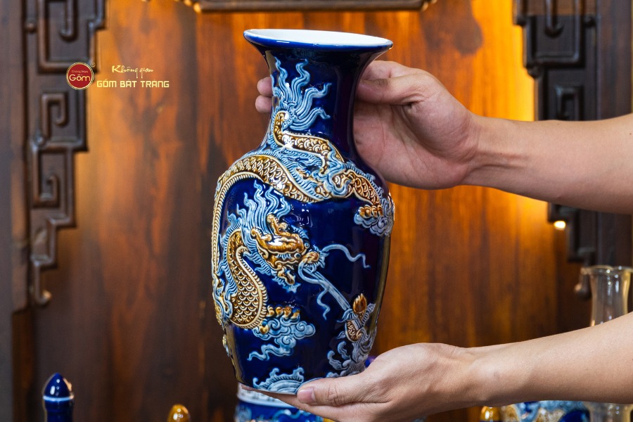 Sắc men Coban tinh tế: Lớp men xanh Coban đặc trưng được phủ đều trên toàn bộ bề mặt, tạo nên vẻ bóng mịn, sâu lắng. Màu xanh Coban không chỉ mang nét hiện đại, sang trọng mà còn mang ý nghĩa phong thủy tốt lành, đặc biệt phù hợp với không gian thờ cúng cần sự tĩnh tại.
