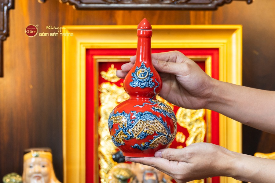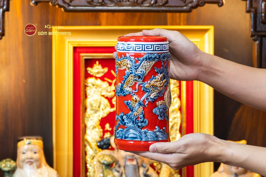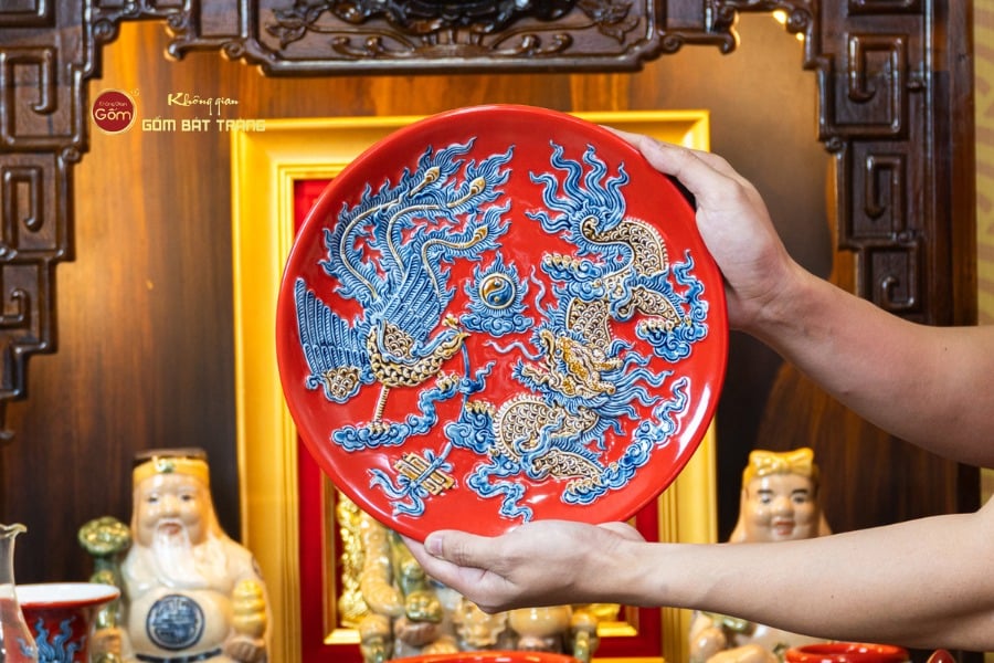 Trên nền men đỏ, các món đồ thường được nghệ nhân trang trí bằng họa tiết Rồng, Phượng hoặc Hoa Sen khắc nổi/vẽ tay tỉ mỉ. Từng đường nét đều toát lên vẻ sống động, mang đậm bản sắc văn hóa Việt và tính thẩm mỹ cao.