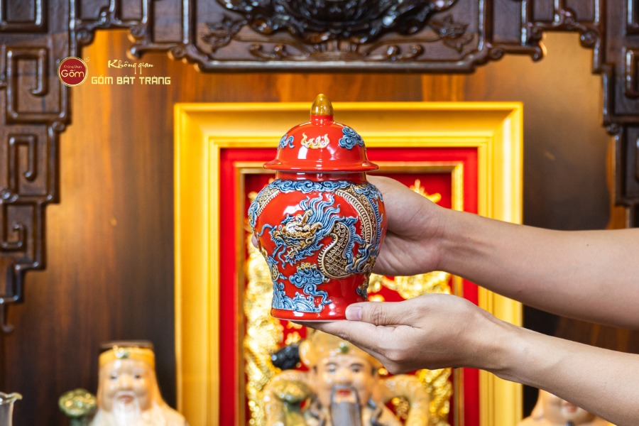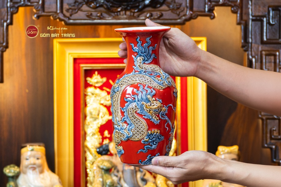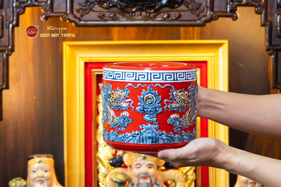 Lớp men đỏ đặc trưng được phủ dày, đều và bóng mịn như ngọc. Màu đỏ không chỉ rực rỡ mà còn mang chiều sâu, tạo cảm giác ấm cúng nhưng vô cùng quyền lực, rất phù hợp với các không gian kinh doanh cần sự nổi bật và thu hút năng lượng tài lộc.