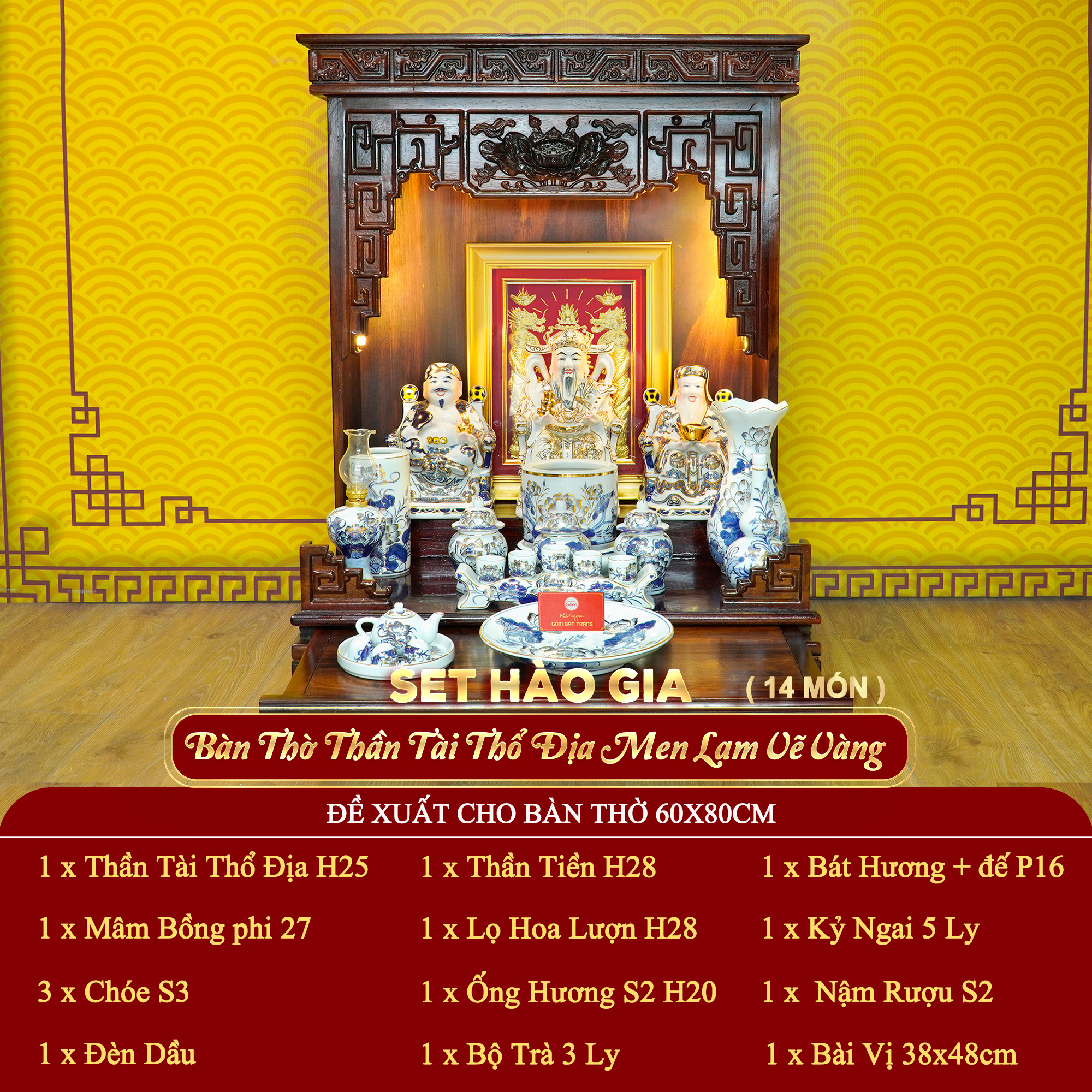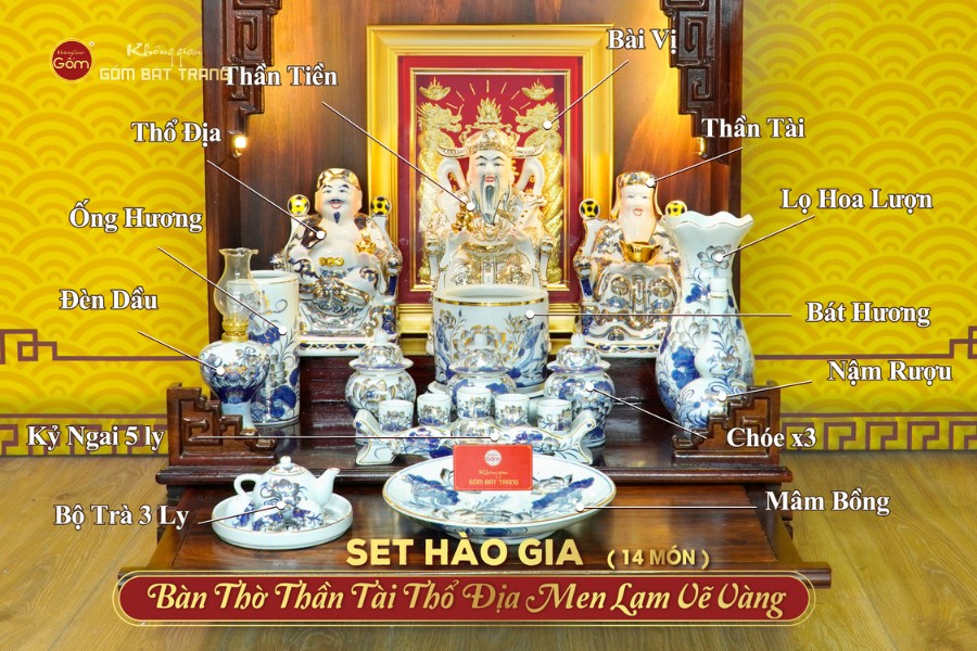 - Tên sản phẩm: [Set Hào Gia] Bộ Đồ Thờ Thần Tài Thổ Địa Men Lam Vẽ Vàng (14 món)