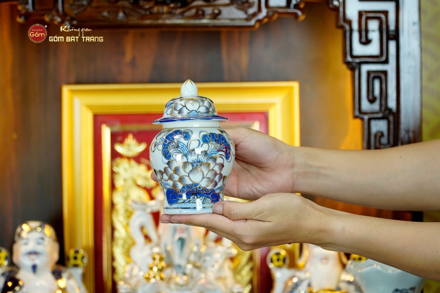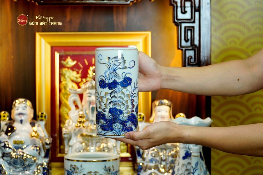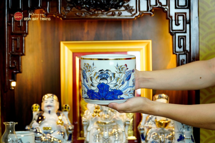 Bề mặt phủ men lam cổ điển, mang sắc xanh trầm ấm tượng trưng cho sự tĩnh tại, thanh khiết. Điểm nhấn đặc biệt là các chi tiết vẽ vàng thủ công tinh xảo, được thực hiện bởi nghệ nhân lành nghề, tạo nên tổng thể sang trọng, quý phái nhưng vẫn giữ được thần thái uy nghiêm, linh thiêng của không gian thờ.