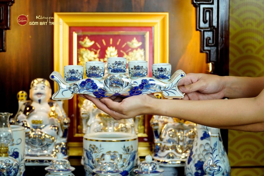 Bộ đồ thờ mang thông điệp tâm linh sâu sắc – chiêu tài, tụ lộc, khai phúc, bình an. Màu men lam tượng trưng cho trí tuệ, sự tĩnh tại và ổn định, giúp cân bằng năng lượng trong không gian thờ, mang lại cảm giác an yên và thanh sạch. Chi tiết vẽ vàng thủ công lại là biểu tượng của phú quý và thịnh vượng, giúp kích hoạt vận khí tài lộc, thu hút may mắn và giữ cho công việc kinh doanh luôn thuận lợi.