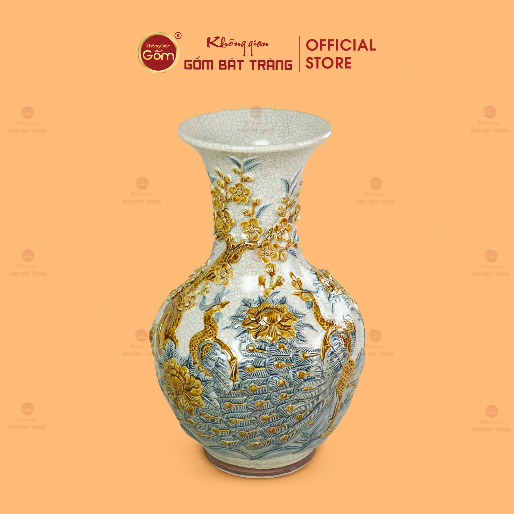 Mỗi chi tiết đắp nổi trên bình đều mang dụng ý phong thủy sâu sắc: Chim Công là loài chim biểu tượng cho vẻ đẹp cao quý, quyền uy và sự may mắn, mang lại hòa hợp trong tình duyên, hôn nhân. Cây Đào là biểu tượng của sự trường thọ, sức khỏe và tài lộc dồi dào. Hai hình tượng kết hợp tạo nên ý nghĩa Phúc Lộc Trường Thọ, Phú Quý Cát Tường và hôn nhân bền vững, viên mãn.