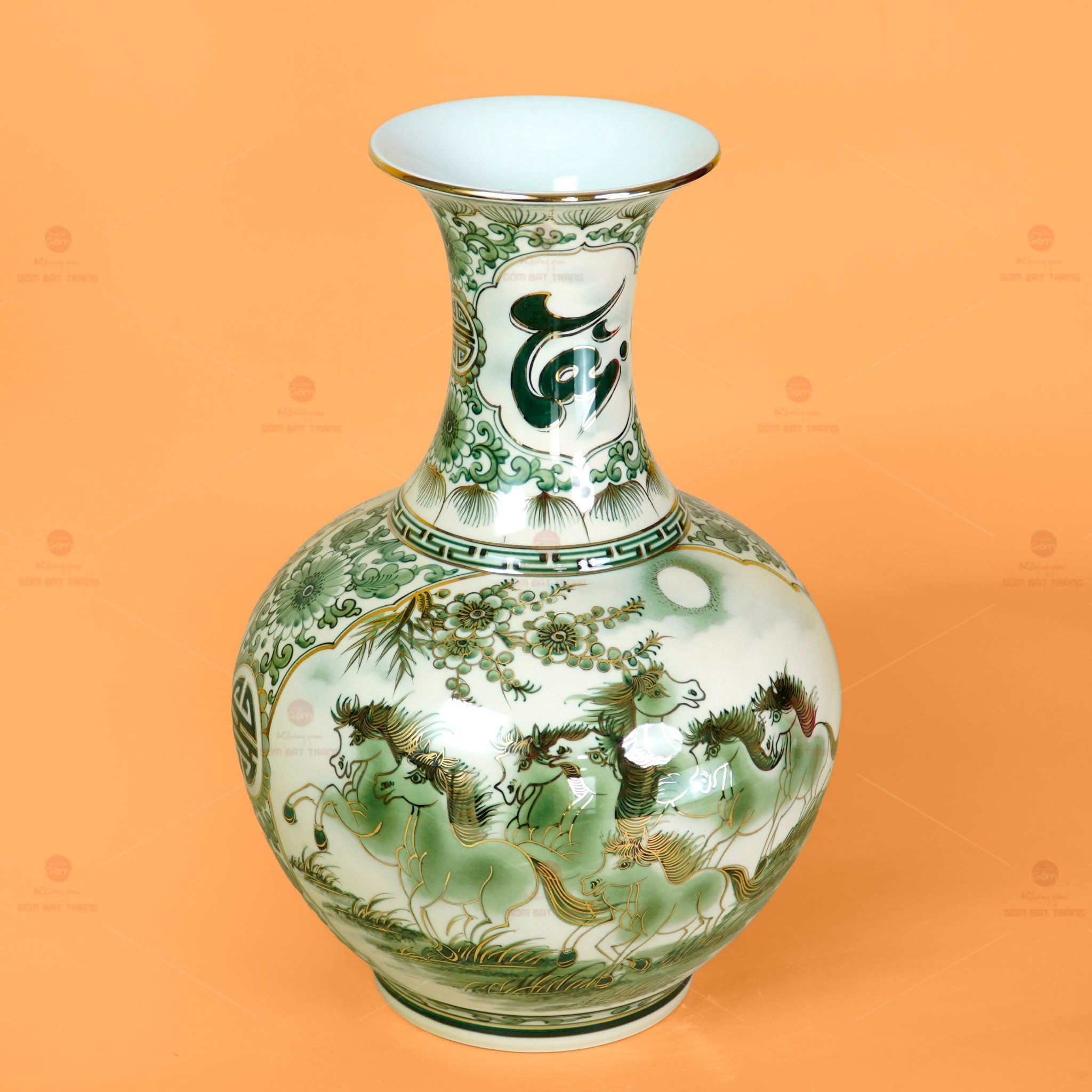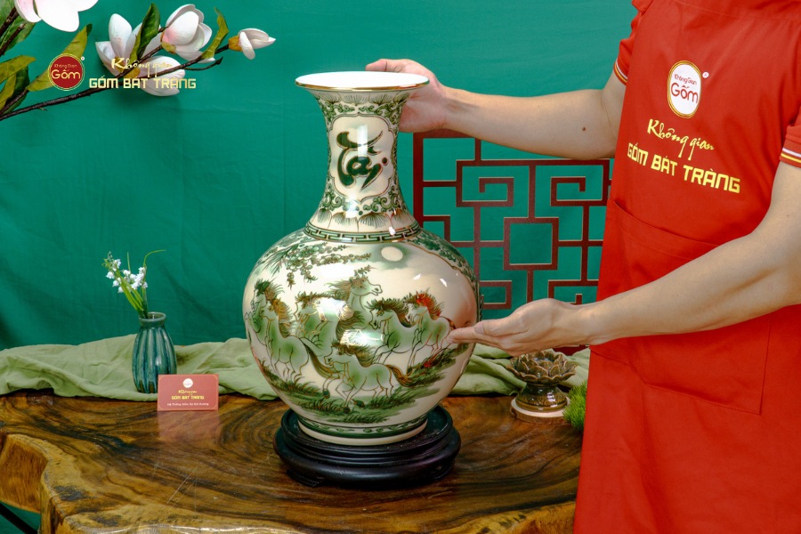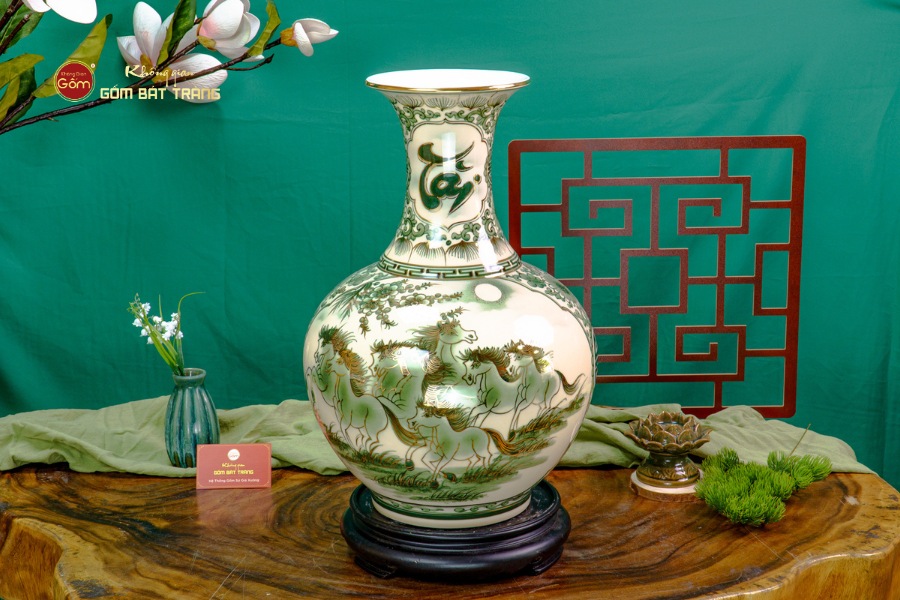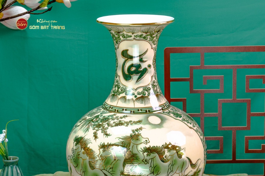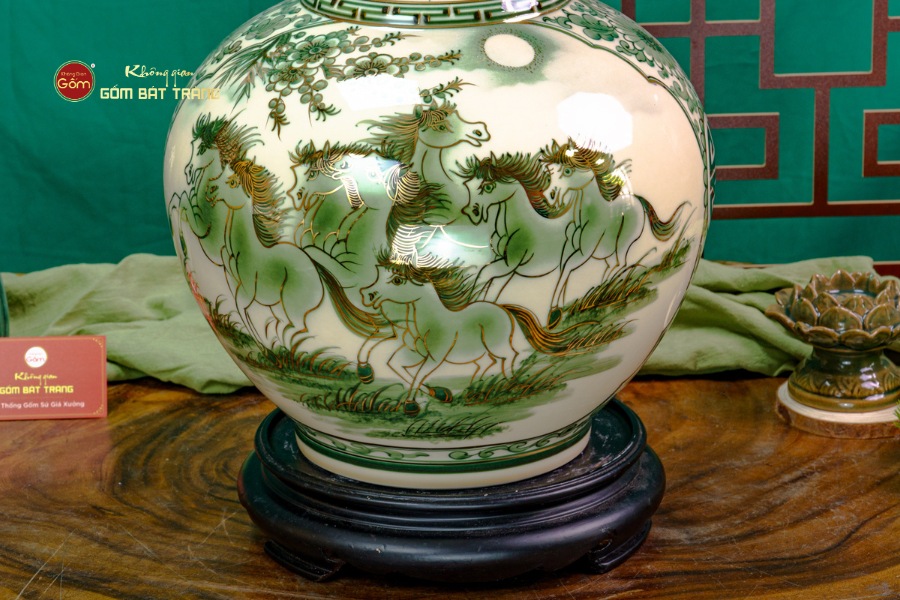 Mỗi chi tiết trên bình đều mang dụng ý phong thủy sâu sắc: hình ảnh tám chú ngựa phi nước đại tượng trưng cho tinh thần tiến bước, ý chí vươn xa và thành công trong sự nghiệp; còn cánh buồm căng gió giữa biển lớn thể hiện cho hành trình hanh thông, “gió thuận, nước êm”, công việc suôn sẻ, thuận lợi. Cả hai hình tượng kết hợp cùng men rực rỡ tạo nên tổng thể hài hòa, vừa vượng khí vừa thẩm mỹ.