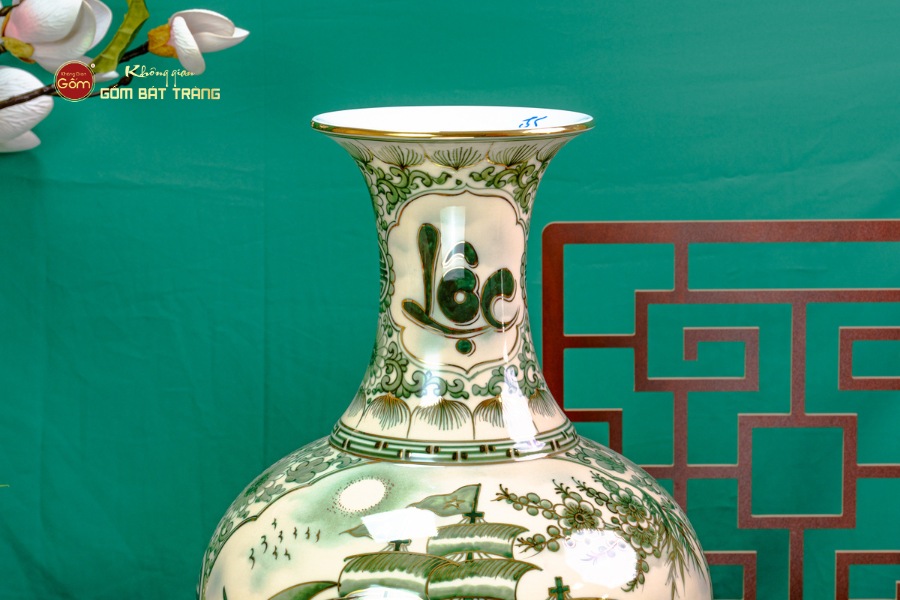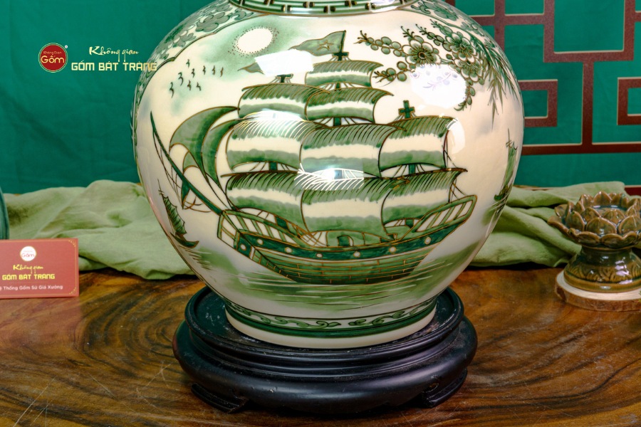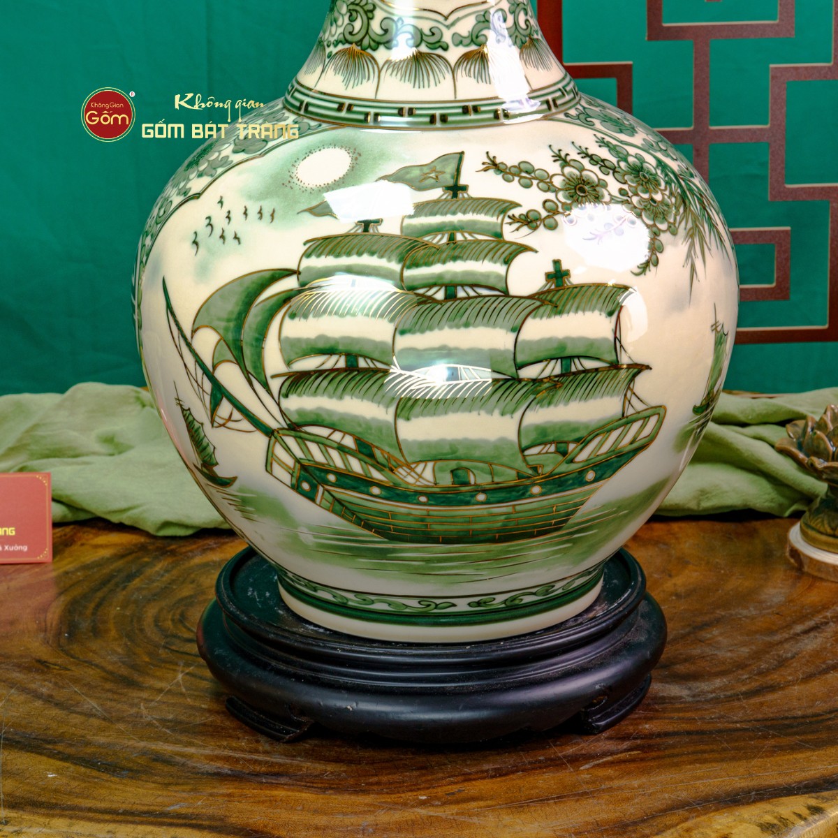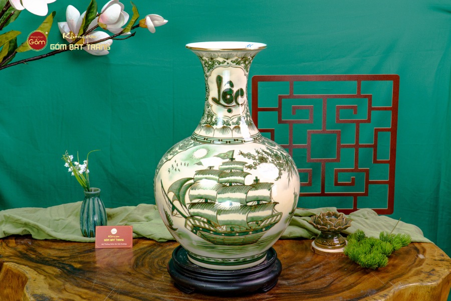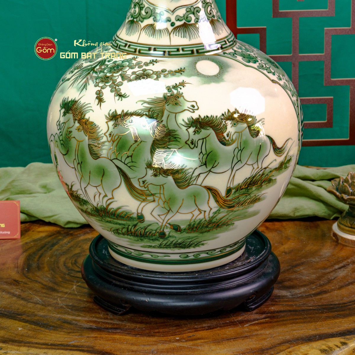 Mỗi chi tiết trên bình đều mang dụng ý phong thủy sâu sắc: hình ảnh tám chú ngựa phi nước đại tượng trưng cho tinh thần tiến bước, ý chí vươn xa và thành công trong sự nghiệp; còn cánh buồm căng gió giữa biển lớn thể hiện cho hành trình hanh thông, “gió thuận, nước êm”, công việc suôn sẻ, thuận lợi. Cả hai hình tượng kết hợp cùng men rực rỡ tạo nên tổng thể hài hòa, vừa vượng khí vừa thẩm mỹ.