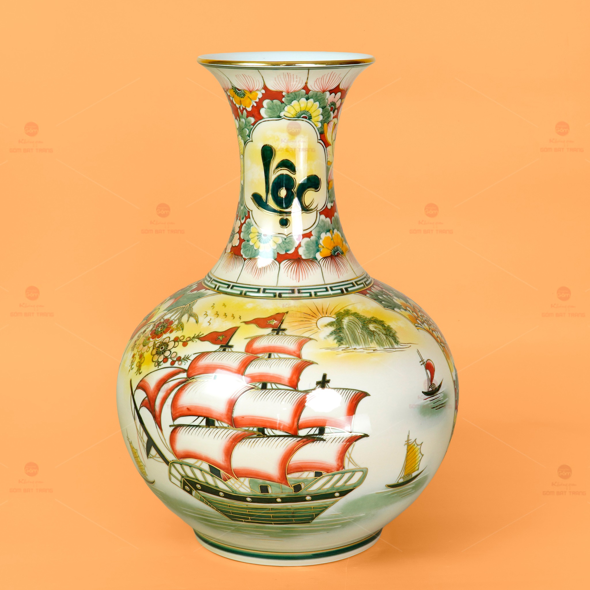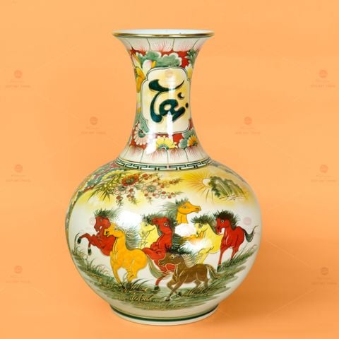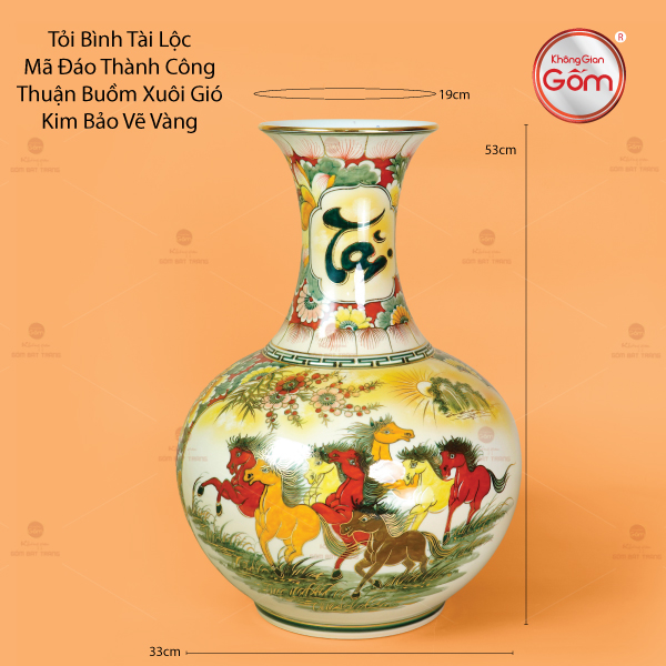 Chiếc tỏi bình mang dáng hình đầy đặn, cổ cao thanh thoát và thân bình căng tròn tượng trưng cho tài lộc viên mãn. Trên thân bình, họa tiết Mã Đáo Thành Công khắc họa đàn ngựa tung vó tiến về phía trước, biểu trưng cho sức mạnh, ý chí và thành công bền bỉ. Cùng với đó, hình ảnh Thuận Buồm Xuôi Gió gợi lên hành trình thuận lợi, công danh hanh thông, tiền tài dồi dào. Hai biểu tượng phong thủy được phối hợp tinh tế, tạo nên sự hài hòa giữa vận khí và thịnh vượng, rất thích hợp để trưng bày tại phòng khách, phòng làm việc hay làm quà tặng đối tác, người thân.