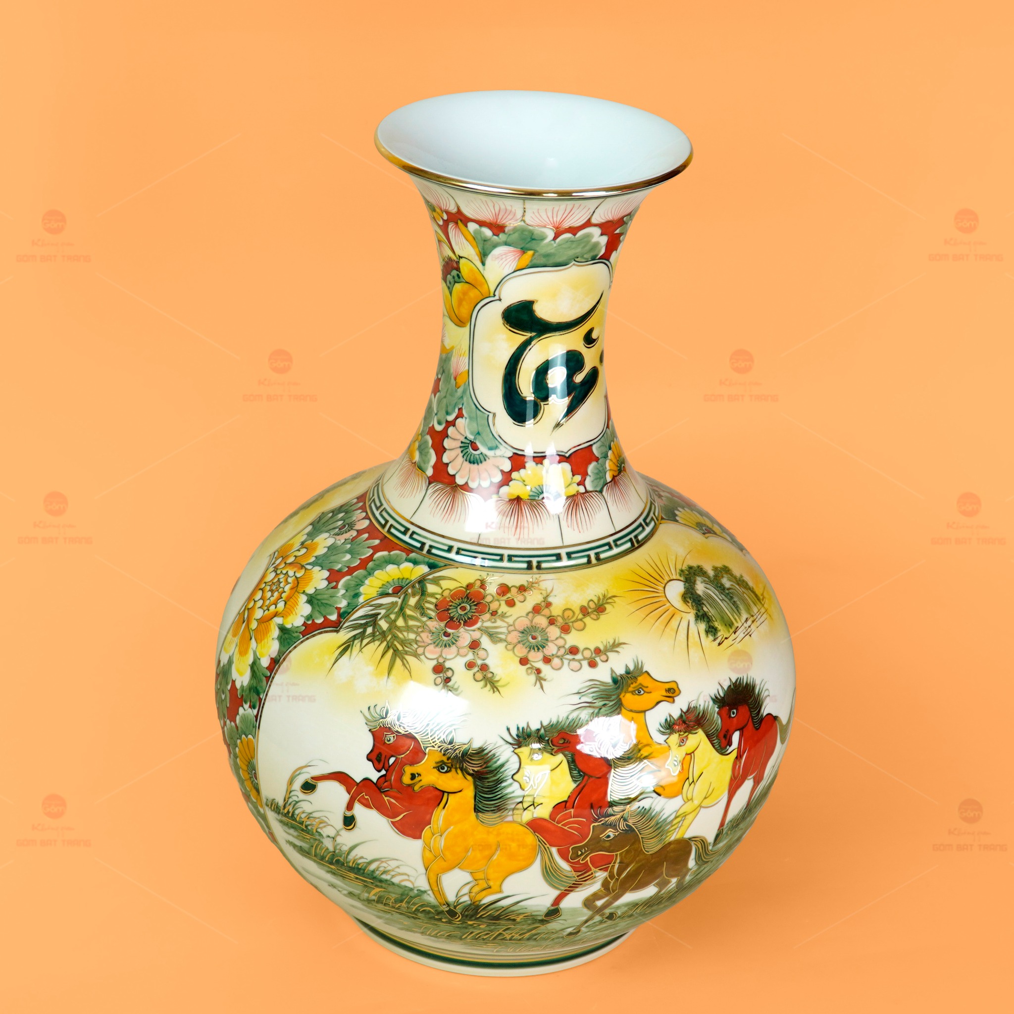 Tỏi Bình Tài Lộc Mã Đáo Thành Công Thuận Buồm Xuôi Gió Kim Bảo Vẽ Vàng là một tuyệt tác gốm sứ Bát Tràng mang đậm giá trị phong thủy và thẩm mỹ, biểu trưng cho phú quý, may mắn và thịnh vượng trong đời sống hiện đại. Sản phẩm là sự kết hợp tinh tế giữa nghệ thuật vẽ vàng cao cấp và sắc men rực rỡ, tạo nên vẻ đẹp sang trọng, tràn đầy năng lượng cát tường cho không gian trưng bày. Không chỉ là món đồ trưng bày đẳng cấp, tỏi bình còn được xem như biểu tượng của may mắn, thành công và sự hanh thông trong công việc, cuộc sống.