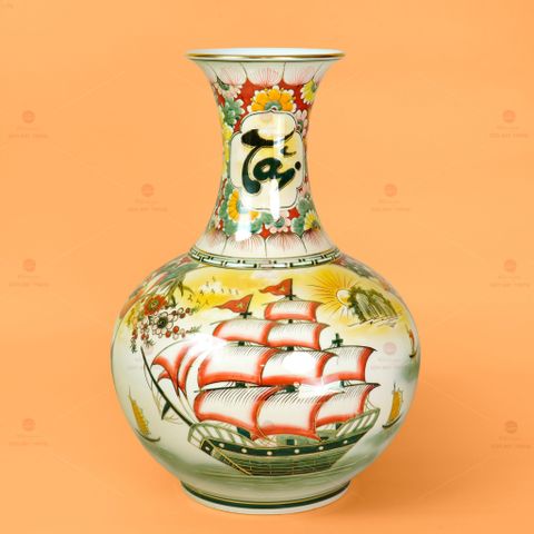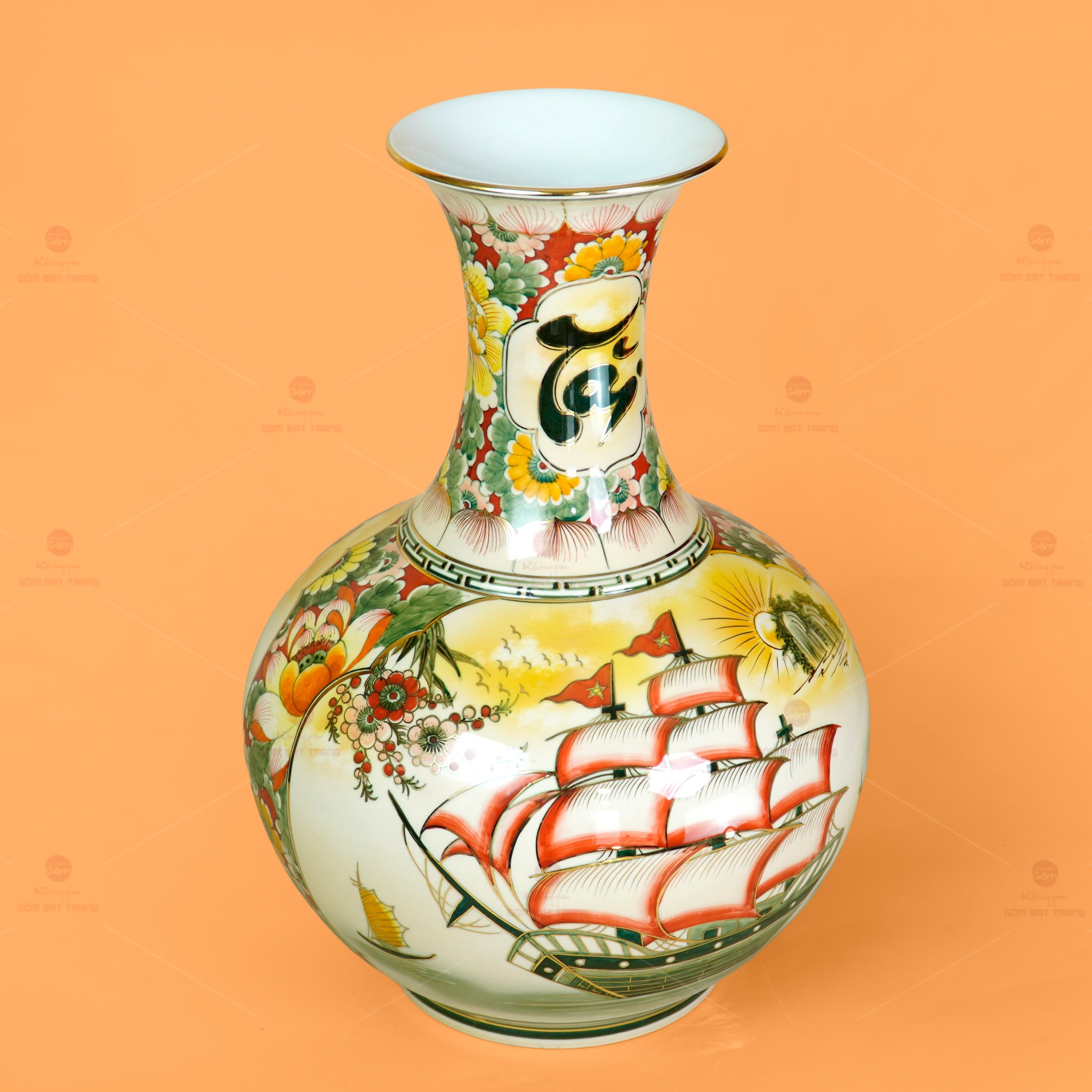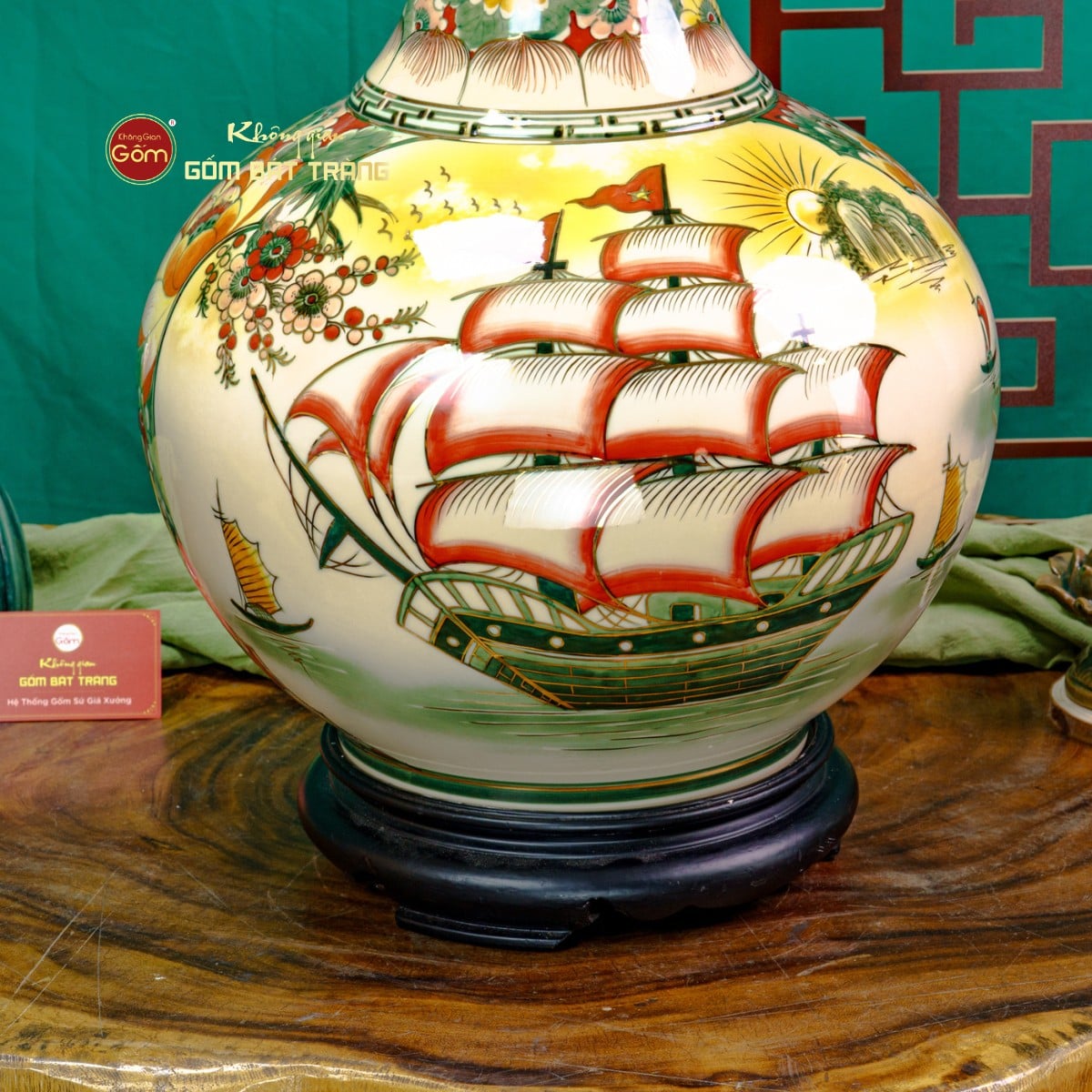 Bộ Tỏi Bình Tài Lộc Kim Bảo Vẽ Vàng là kết tinh của bàn tay tài hoa và tinh thần nghệ nhân Bát Tràng. Từ công đoạn tạo hình, phủ men, vẽ họa tiết đến nung lửa đều được kiểm soát tỉ mỉ, nhằm đảm bảo từng đường nét đạt đến độ hoàn mỹ và cân đối. Sắc men ngọc phản chiếu ánh sáng vàng kim tạo nên cảm giác ấm áp, phú quý và viên mãn. Mỗi chiếc bình là một bức tranh sống động, tái hiện hình ảnh thiên nhiên, thuyền buồm, đàn ngựa – tất cả được hòa quyện trong không gian tươi sáng, rực rỡ của niềm tin và khát vọng.