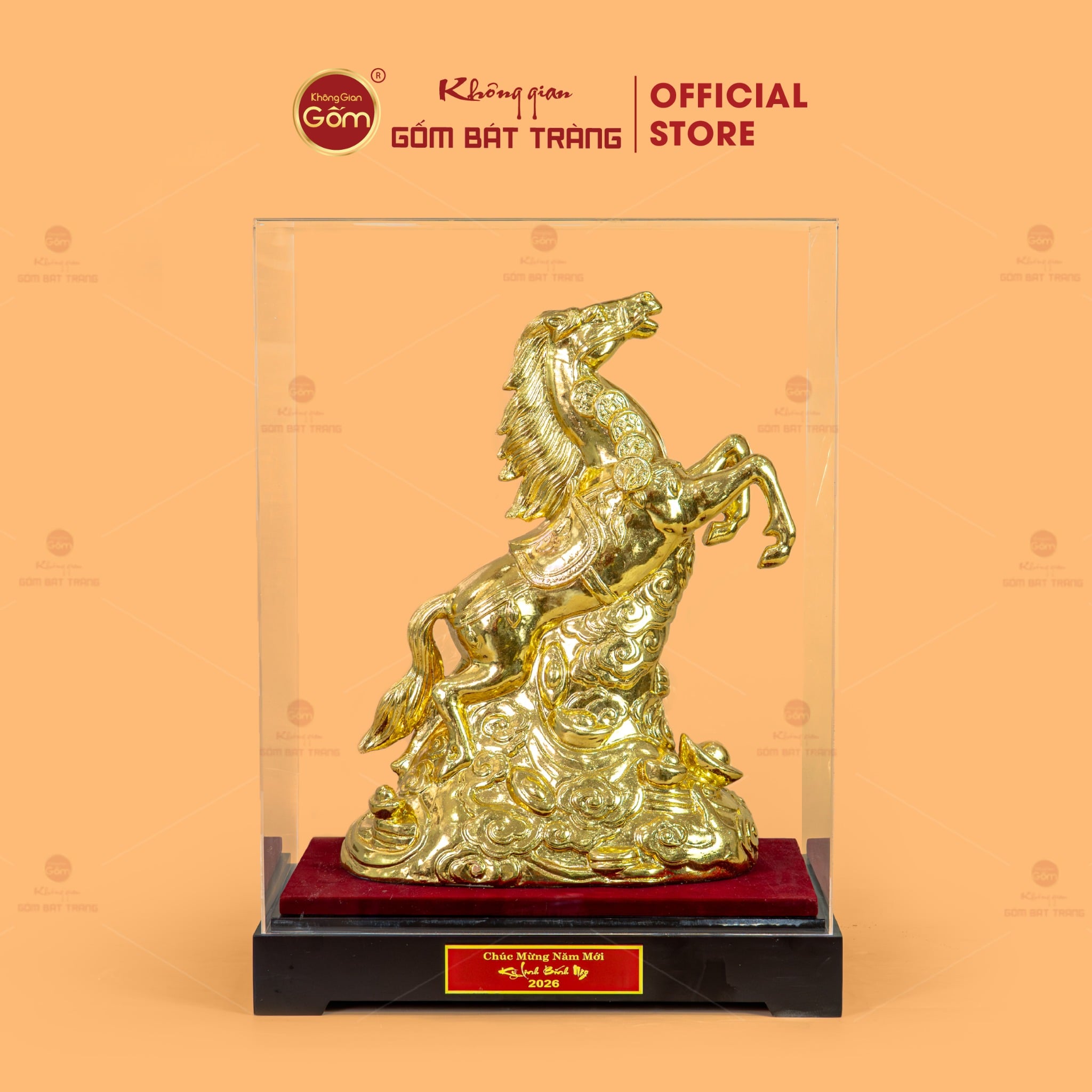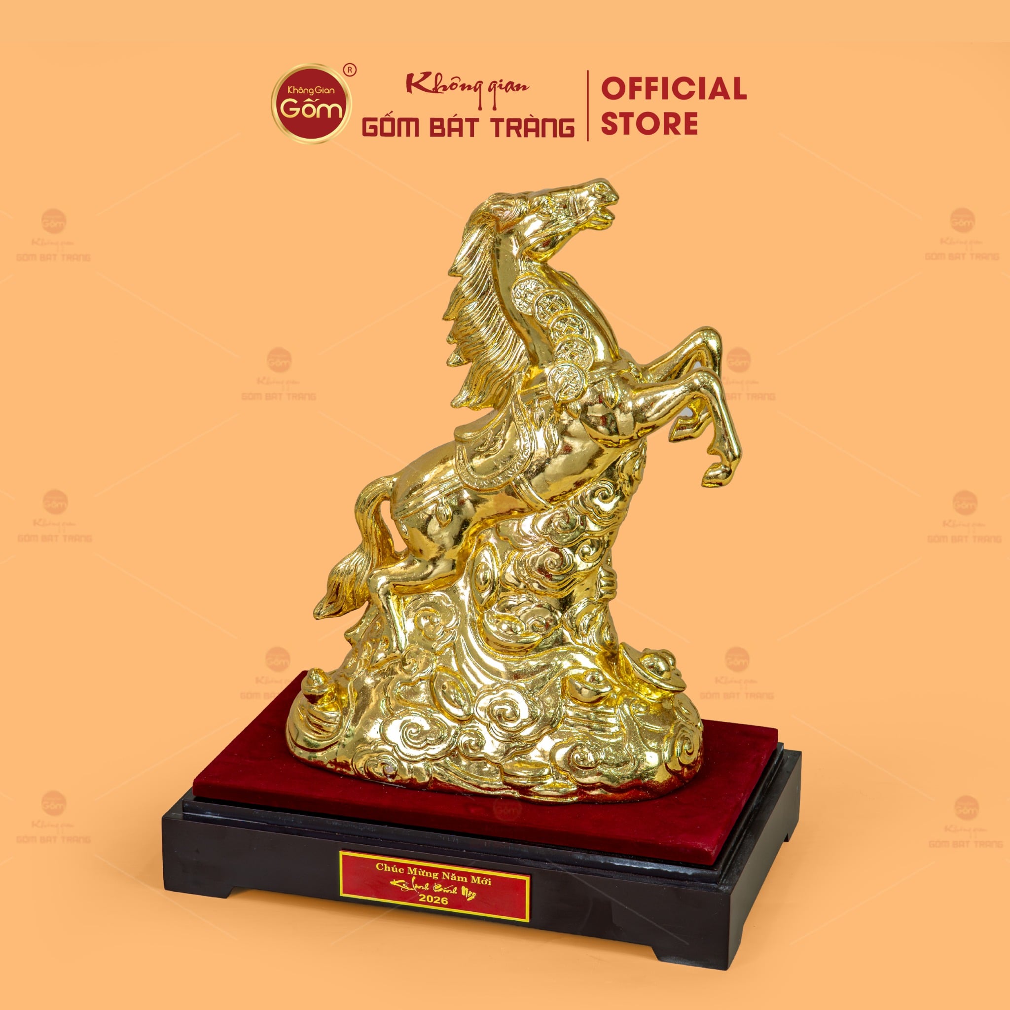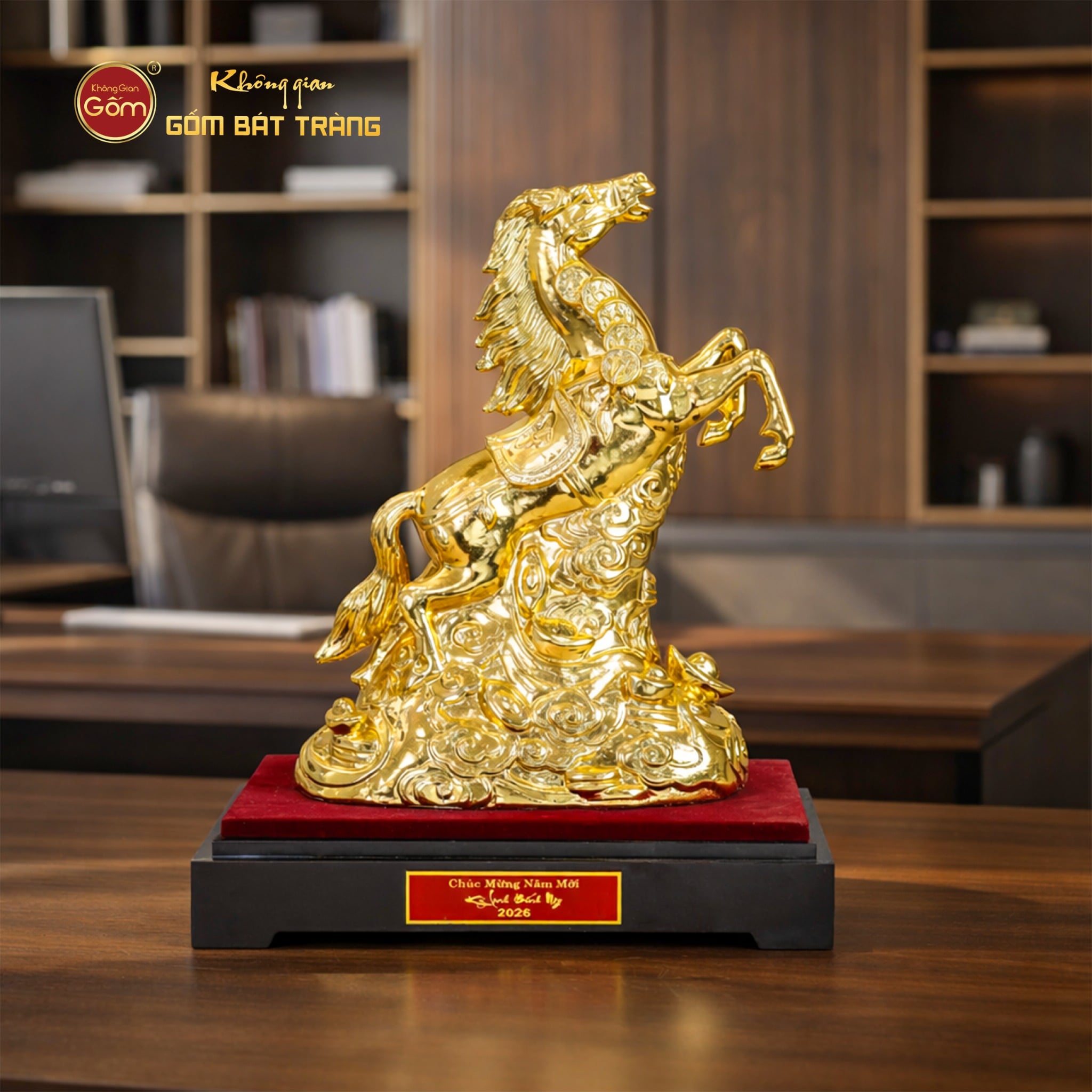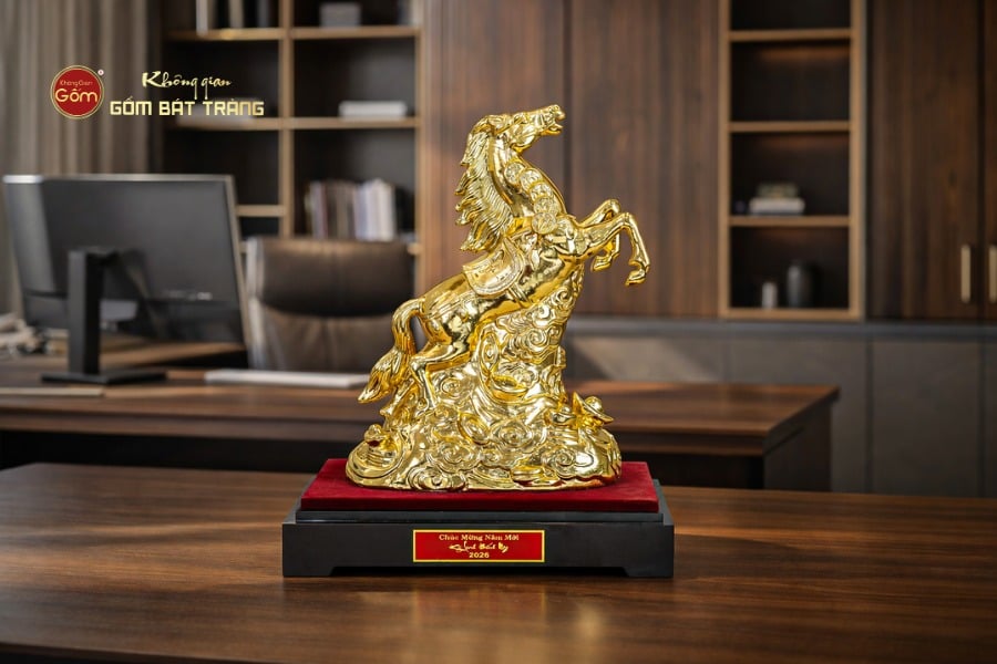 Tượng Linh Vật Ngựa Mạ Vàng được phân phối tại Không Gian Gốm Bát Tràng – đơn vị chuyên cung cấp gốm sứ nghệ thuật, linh vật phong thủy và quà tặng cao cấp mang giá trị thẩm mỹ và văn hóa.