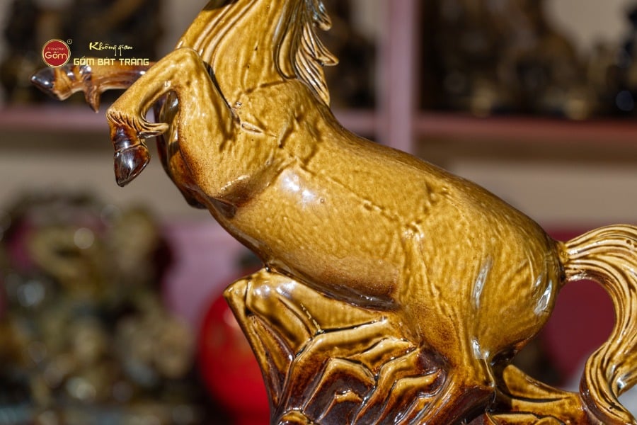 Sản phẩm được chế tác hoàn toàn bằng gốm sứ Bát Tràng chất lượng cao, tạo hình chú ngựa trong tư thế đứng vững – đầu ngẩng cao – bờm tung nhẹ theo gió. Từng thớ cơ, nét gân, độ chuyển động qua dáng đứng đều được các nghệ nhân thể hiện tinh tế, sinh động và đầy uy lực.