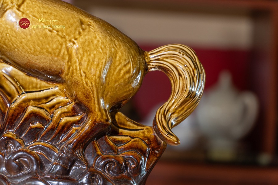 Điểm nổi bật nhất của Tượng Ngựa Hoàng Kim Mã nằm ở sắc men trầm cổ, gam màu xanh – nâu – đen hòa quyện tạo chiều sâu, phù hợp đặt trong không gian sang trọng và nghiêm cẩn. Lớp men sậm không chỉ giúp tổng thể trở nên cổ kính, quyền uy mà còn mang tác dụng phong thủy mạnh mẽ trong việc ổn định năng lượng và hút vận khí tốt.