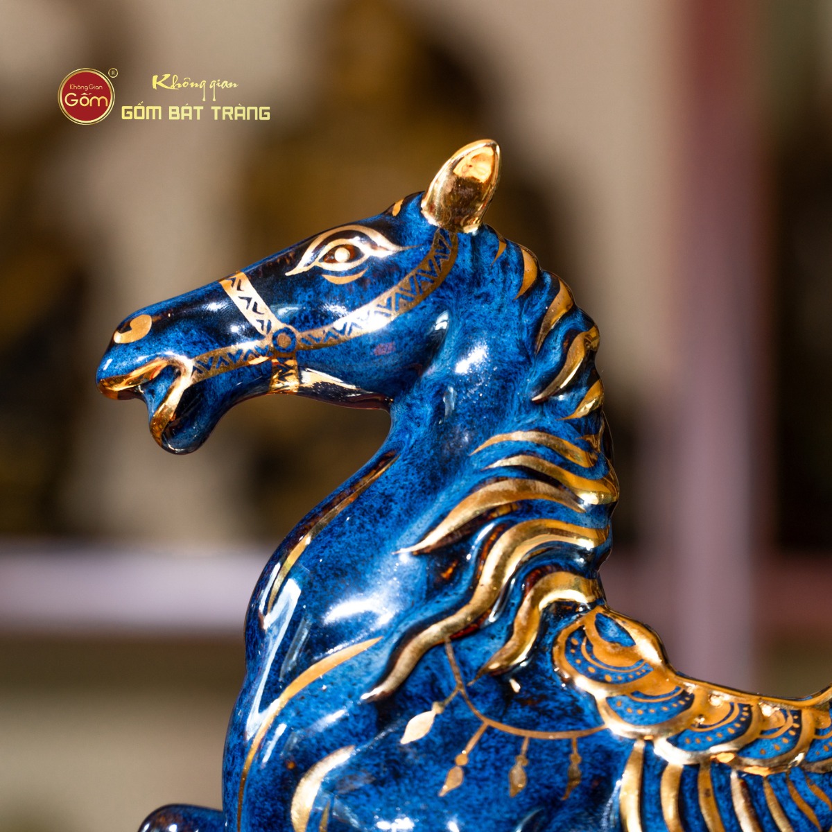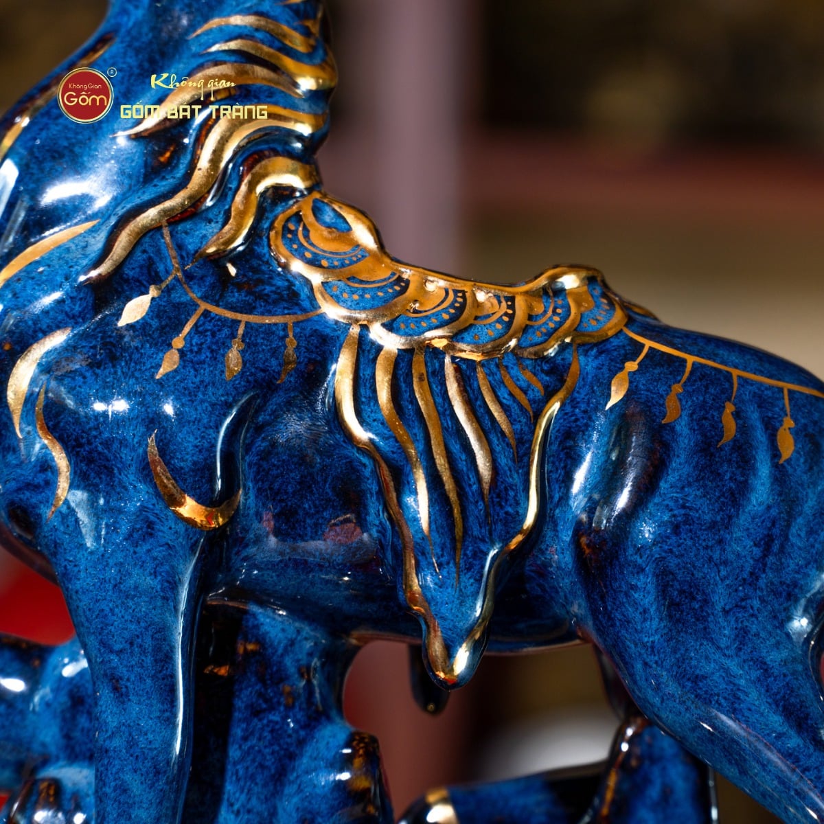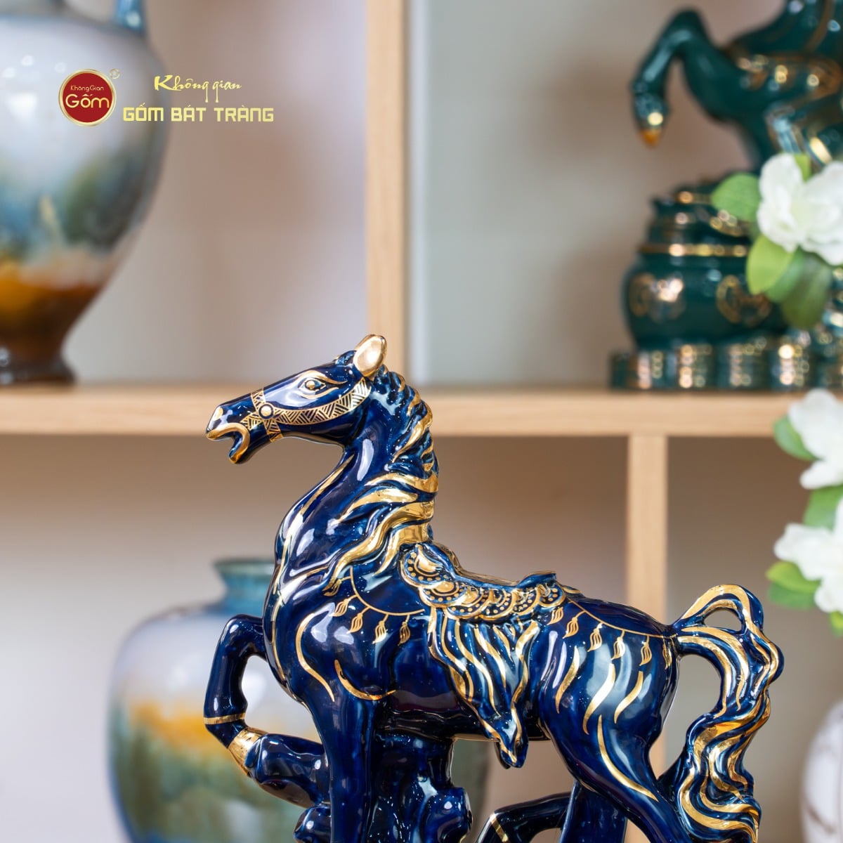 Tượng Ngựa Kim Mã Vân Mao là tác phẩm gốm sứ phong thủy mang thần thái mạnh mẽ nhưng vẫn giữ được sự chừng mực và tinh tế trong tạo hình. Hình ảnh ngựa đứng vững vàng trên đế, đầu ngẩng cao, thân hình săn chắc thể hiện tinh thần bền bỉ, chủ động và sẵn sàng tiến bước. Sản phẩm phù hợp với những không gian cần điểm nhấn phong thủy rõ nét, đồng thời vẫn đảm bảo tính hài hòa trong tổng thể bài trí. Không thiên về sự phô trương, Kim Mã Vân Mao tập trung thể hiện khí chất nội tại của linh vật ngựa, biểu trưng cho ý chí vươn lên, sự ổn định và phát triển bền vững theo thời gian.