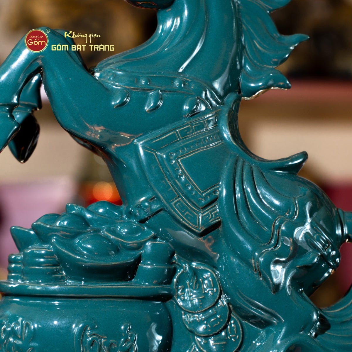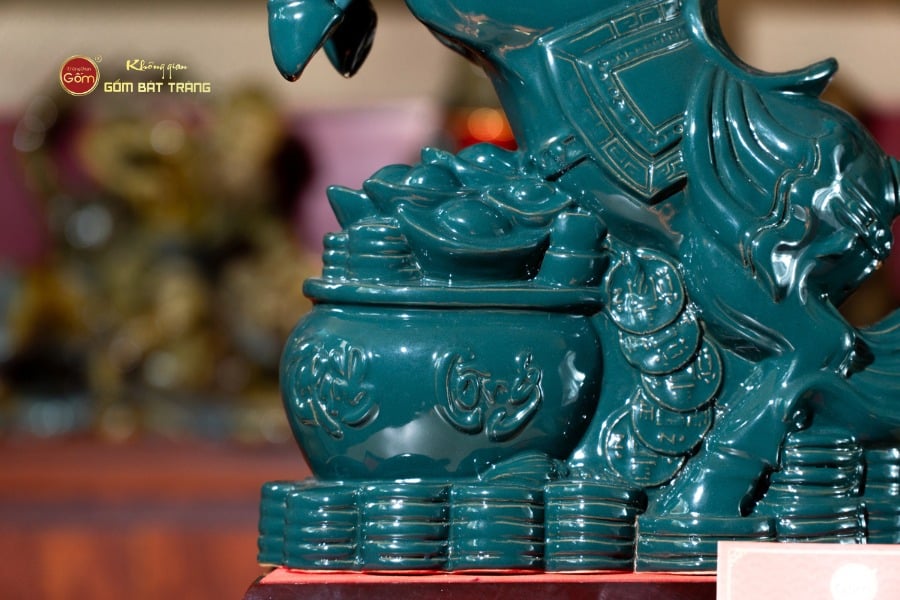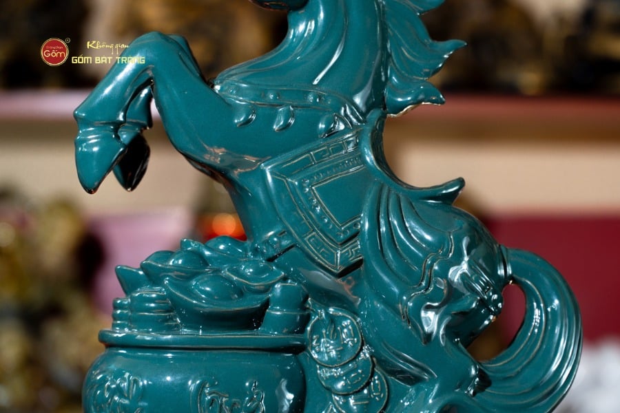Điểm nổi bật nhất của Tượng Ngựa Lục Mã Bình An nằm ở sắc men trầm cổ tạo chiều sâu, phù hợp đặt trong không gian sang trọng và nghiêm cẩn. Lớp men sậm không chỉ giúp tổng thể trở nên cổ kính, quyền uy mà còn mang tác dụng phong thủy mạnh mẽ trong việc ổn định năng lượng và hút vận khí tốt.