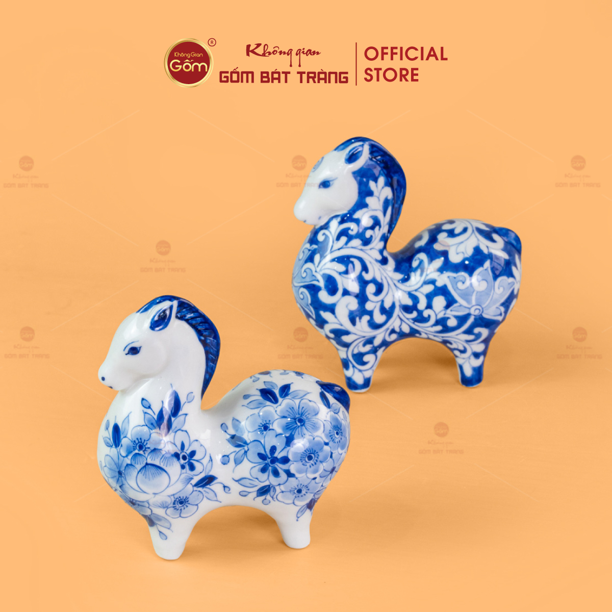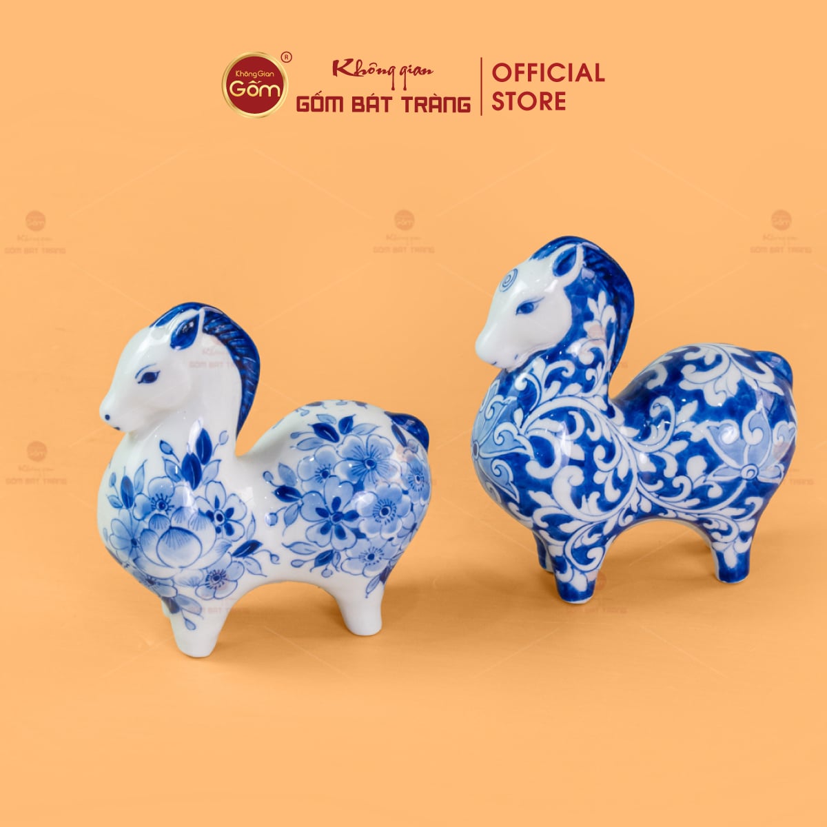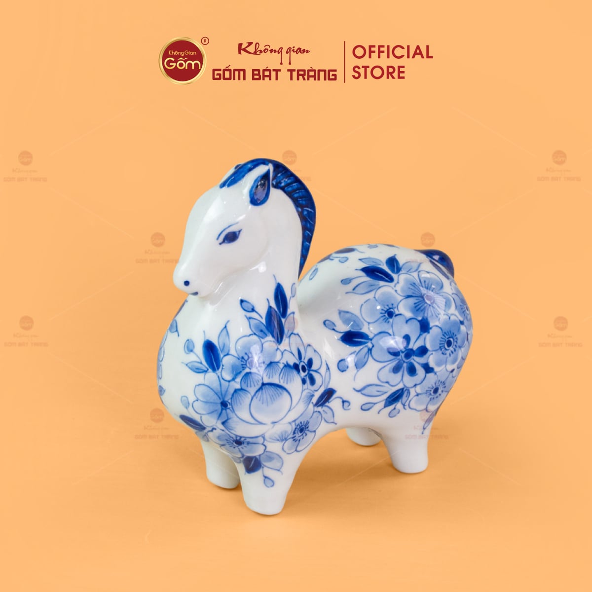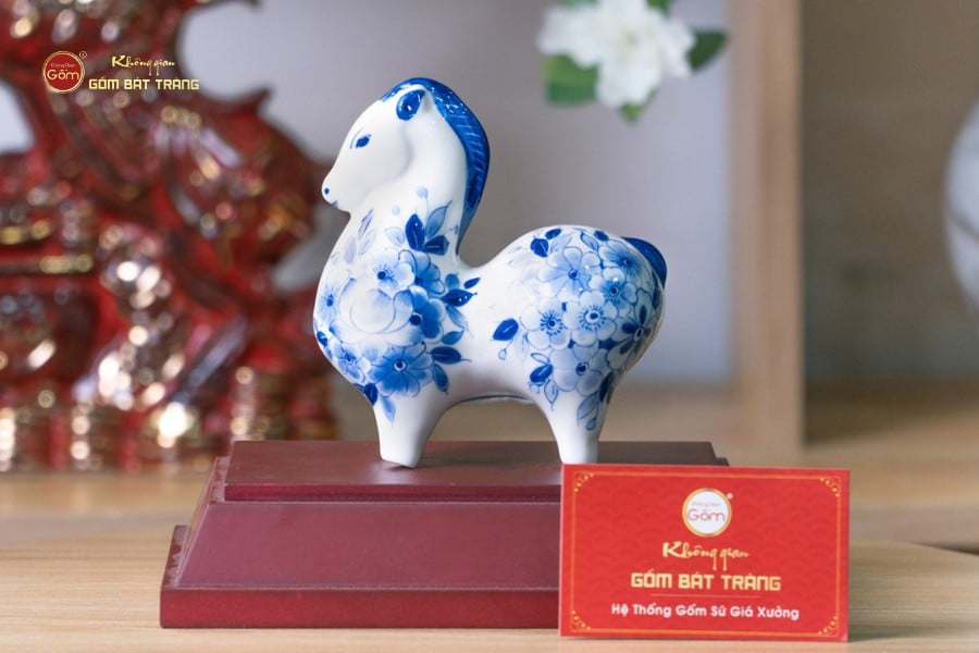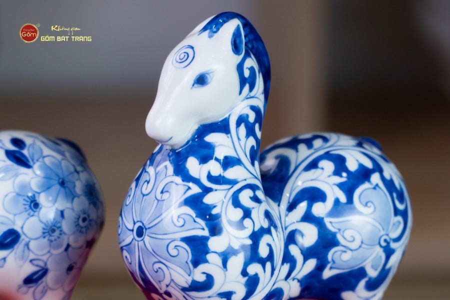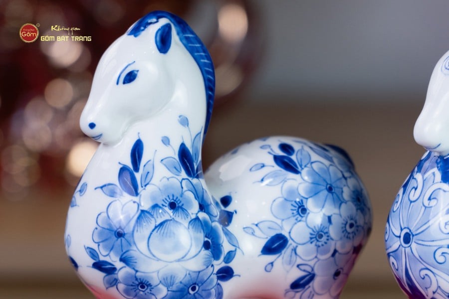 Lớp men lam xanh cobalt đặc trưng được nung ở nhiệt độ cao, tạo chiều sâu màu sắc, vừa cổ điển vừa sang trọng. Trên nền men trắng ngà, các họa tiết hoa văn được vẽ tay tỉ mỉ, sắc nét, mang phong cách truyền thống nhưng vẫn phù hợp với không gian sống hiện đại. Mỗi tượng ngựa là một tác phẩm độc bản, không trùng lặp hoàn toàn, thể hiện rõ dấu ấn cá nhân của người nghệ nhân.