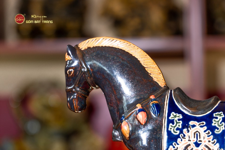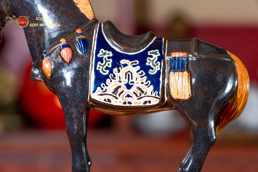 Điểm nhấn nổi bật của mẫu tượng này nằm ở phần yên ngựa họa tiết màu sắc nổi bật, được các nghệ nhân vẽ tay tỉ mỉ với họa tiết truyền thống tinh xảo. Sự kết hợp giữa tông đen chủ đạo và màu men rực rỡ của yên ngựa tạo nên sự đối lập hài hòa, giúp tác phẩm vừa uy nghi vừa thu hút ánh nhìn.