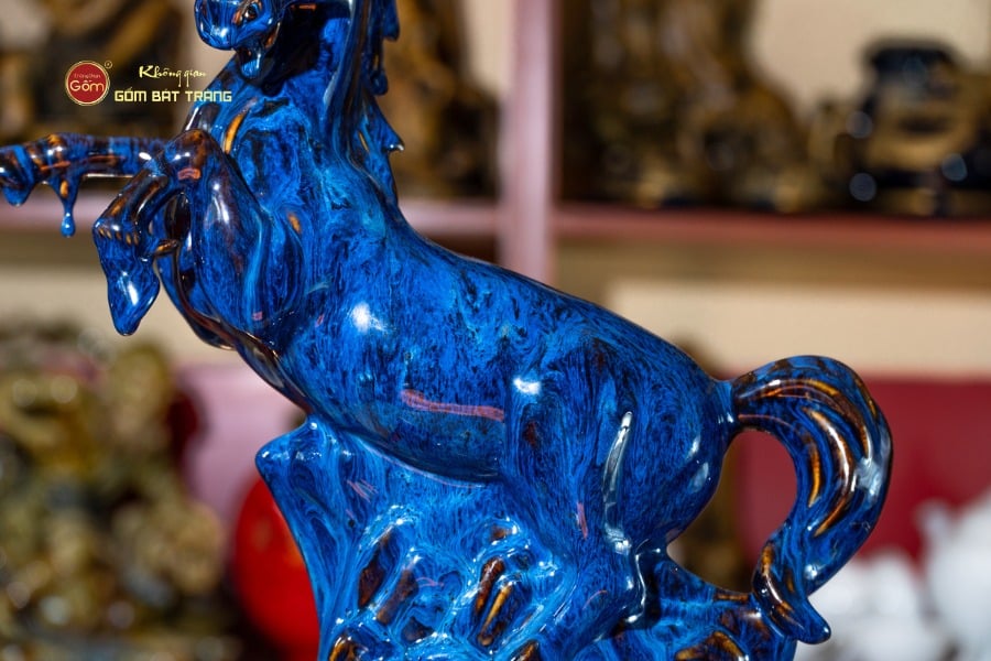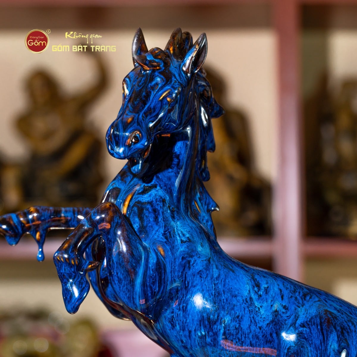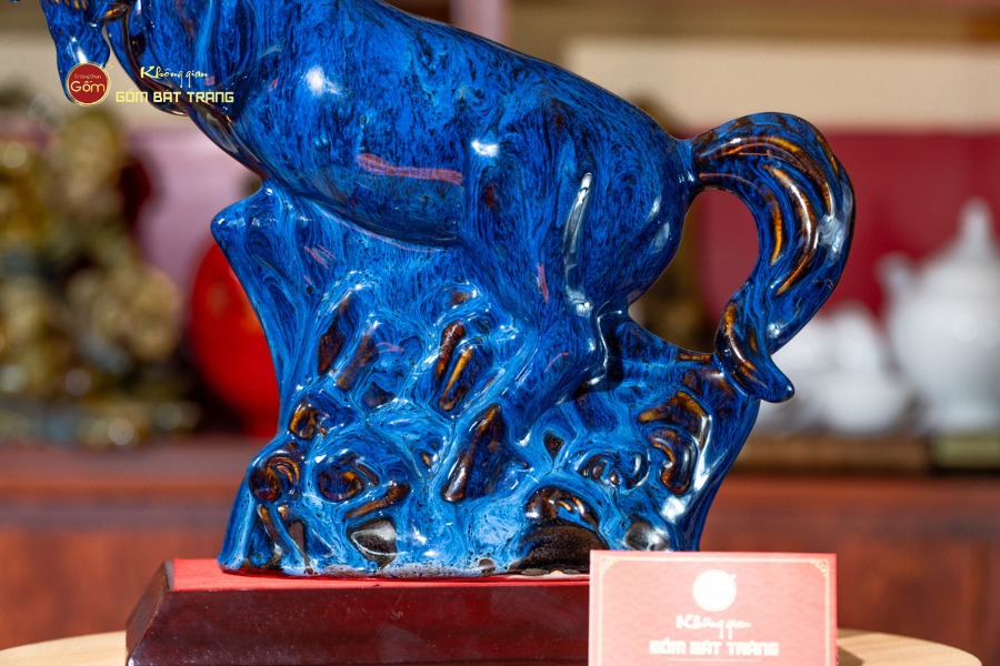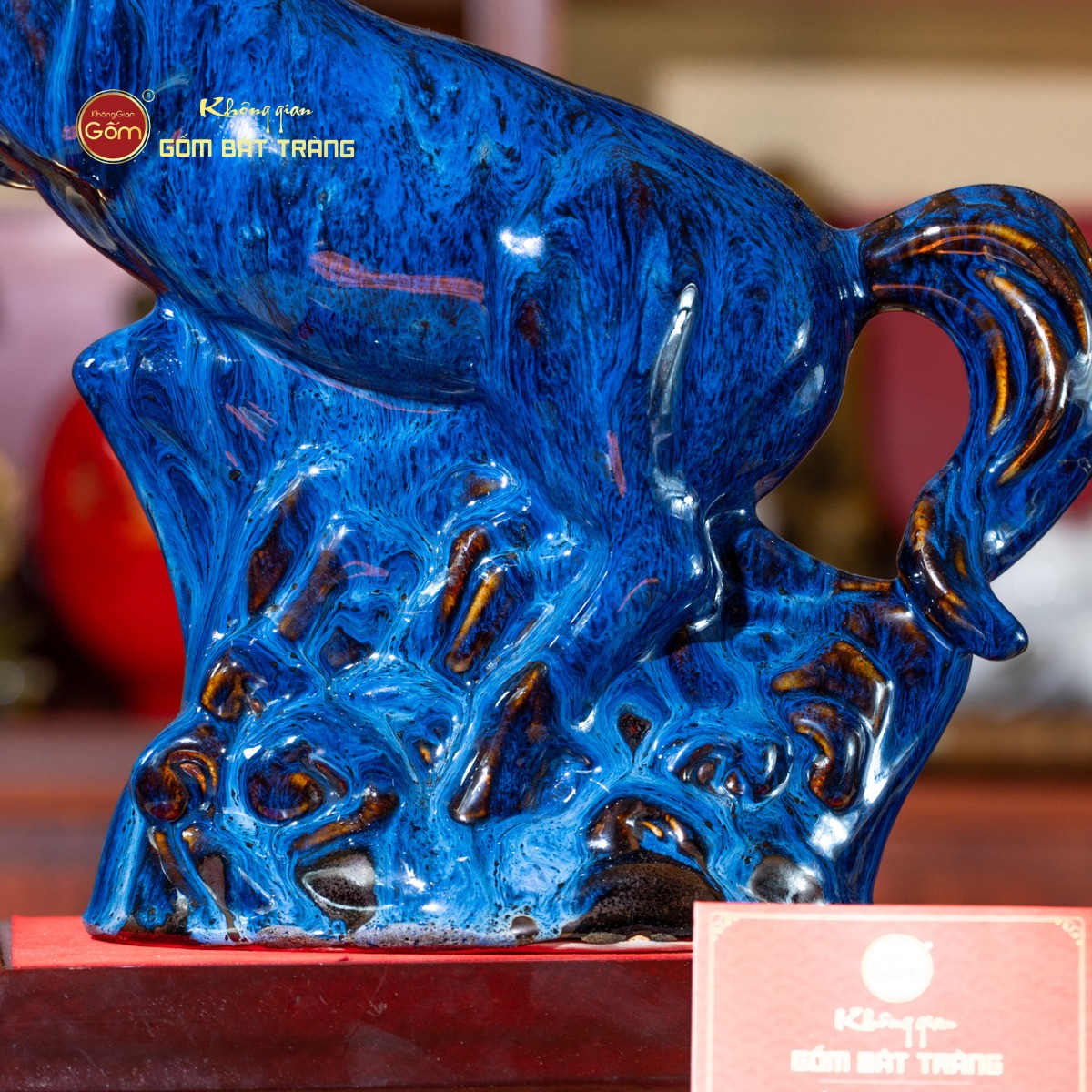 Điểm nổi bật nhất của Tượng Linh Vật Bính Ngọ nằm ở sắc men trầm cổ, gam màu xanh – nâu – đen hòa quyện tạo chiều sâu, phù hợp đặt trong không gian sang trọng và nghiêm cẩn. Lớp men sậm không chỉ giúp tổng thể trở nên cổ kính, quyền uy mà còn mang tác dụng phong thủy mạnh mẽ trong việc ổn định năng lượng và hút vận khí tốt.