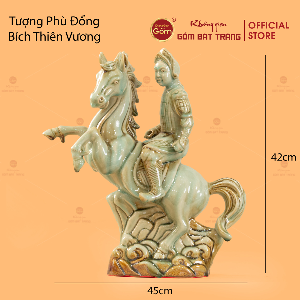 Tượng Phù Đổng Bích Thiên Vương nổi bật với hình tượng Thánh Gióng cưỡi ngựa trong tư thế khí khái, vươn mình tiến về phía trước. Tác phẩm có kích thước 42cm cao – 45cm ngang, tỷ lệ uy nghi, phù hợp đặt ở phòng khách, phòng làm việc, gian thờ tổ tiên hoặc không gian trưng bày linh thiêng.
