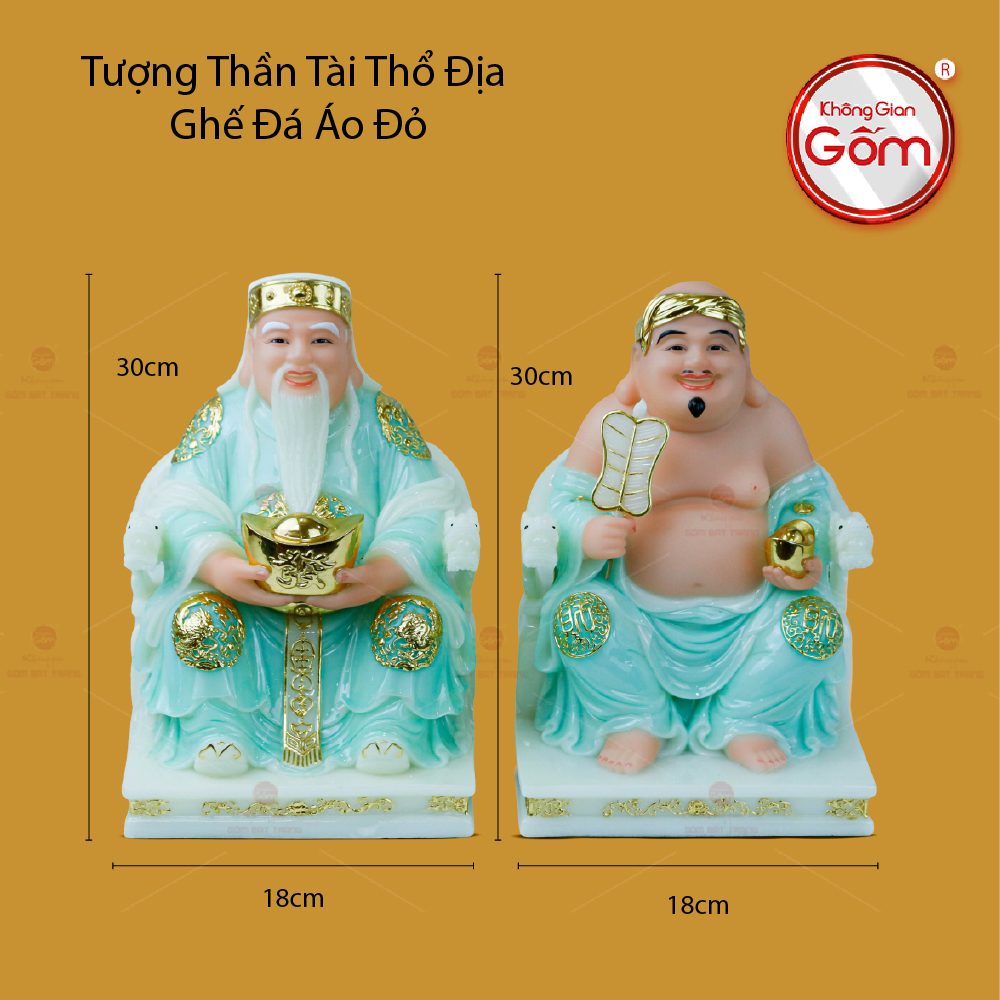 Tượng Thần Tài Thổ Địa Ghế Rồng Màu Xanh Ngọc là bộ đôi quen thuộc đối với người Việt. Hai vị thần được tạo tác với thần thái tươi vui, hoan hỷ, phần cốt tượng cứng cáp và chắc chắn với những đường nét khéo léo và tinh tế; tất cả tạo nên tổng thể hài hoà, sinh động như thật. Bộ đôi Thần Tài - Thổ Địa là hai vị thần không thể thiếu, được đặt trang trọng trên bàn thờ để cầu mong sự may mắn, tài lộc và bình an cho gia đình và công việc kinh doanh. Tượng Thần Tài - Thổ Địa bằng sứ không chỉ là vật phẩm tâm linh mà còn là một tác phẩm nghệ thuật, thể hiện sự tinh tế trong chế tác gốm sứ truyền thống.