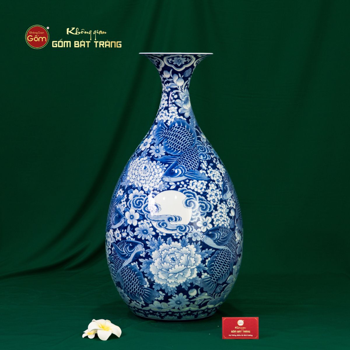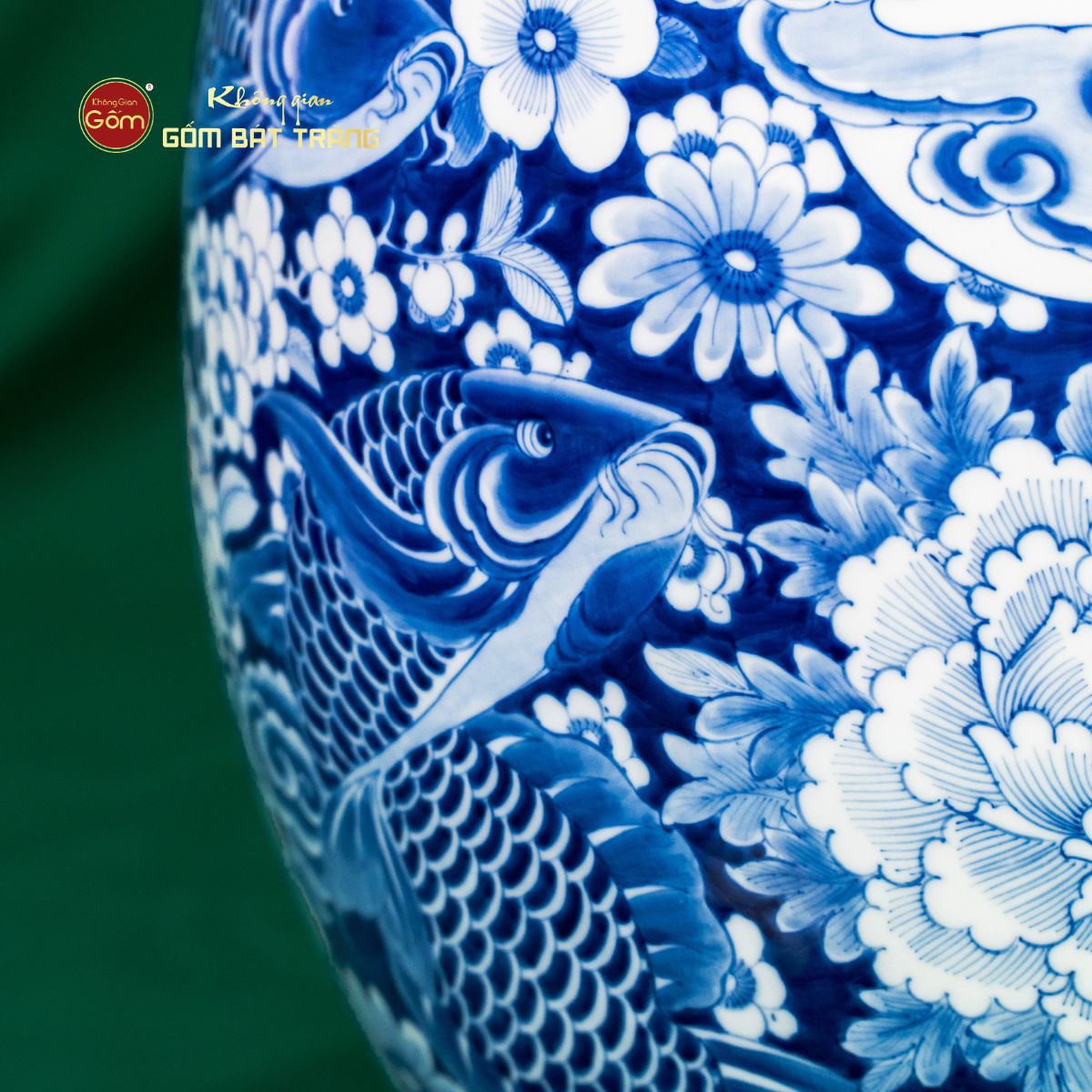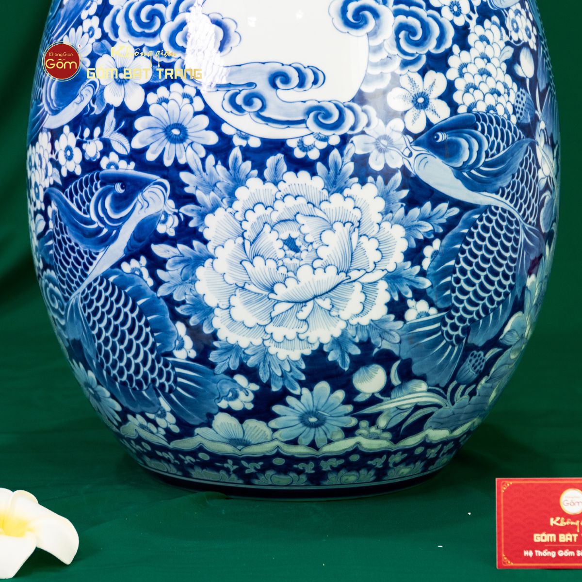 Trên thân bình, họa tiết “Cửu Ngư Chầu Nguyệt” được vẽ tay thủ công vô cùng tinh xảo. Hình ảnh chín chú cá chép bơi lượn xung quanh vầng trăng tròn nổi bật ở trung tâm, kết hợp cùng những đóa mẫu đơn, hoa cúc và các loài hoa quý, tạo nên tổng thể hài hòa, sinh động và giàu tính nghệ thuật. Từng chi tiết vảy cá, cánh hoa, gợn sóng đều được thể hiện sắc nét, sống động, tôn vinh tay nghề điêu luyện của nghệ nhân Bát Tràng.